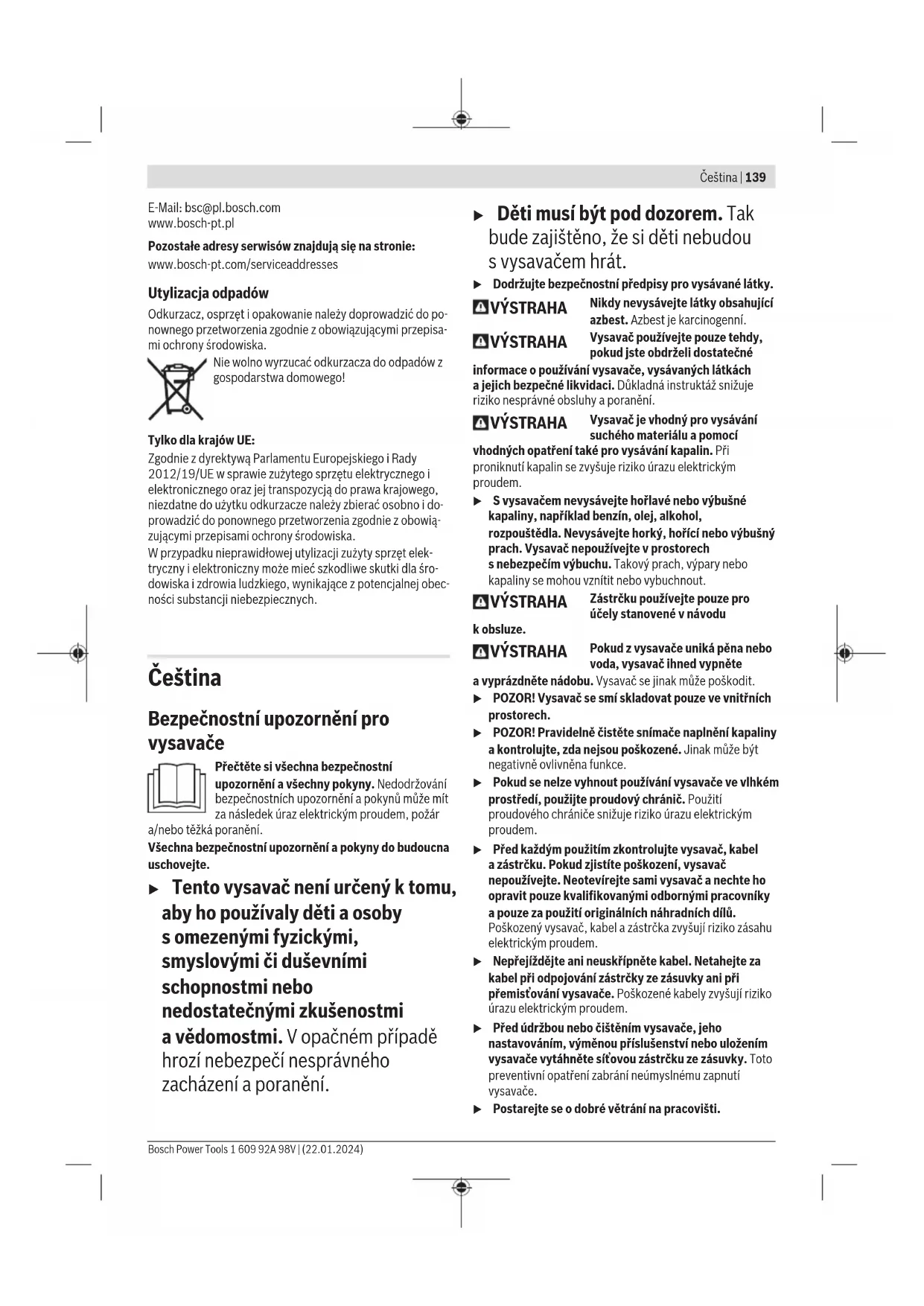 Obsługa klienta oraz doradztwo dotyczące użytkowania Ze wszystkimi pytaniami, dotyczącymi naprawy ikonserwa- cji nabytego produktu oraz dostępu do części zamiennych, prosimy zwracać się do punktów obsługi klienta. Rysunki techniczne oraz informacje o częściach zamiennych można znaleźć pod adresem: www.bosch-pt.com Nasz zespół doradztwa dotyczącego użytkowania odpowie na wszystkie pytania związane z produktami firmy Bosch oraz ich osprzętem. Przy wszystkich zgłoszeniach oraz zamówieniach części za- miennych konieczne jest podanie 10‑cyfrowego numeru ka- talogowego, znajdującego się na tabliczce znamionowej pro- duktu. Polska Robert Bosch Sp. z o.o. Serwis Elektronarzędzi Ul. Jutrzenki 102/104 02-230 Warszawa Na www.serwisbosch.com znajdą Państwo wszystkie szcze- góły dotyczące usług serwisowych online. Tel.: 22 7154450 Faks: 22 7154440 1 609 92A 98V | (22.01.2024) Bosch Power ToolsČeština | 139 E-Mail: bsc@pl.bosch.com www.bosch-pt.pl Pozostałe adresy serwisów znajdują się na stronie: www.bosch-pt.com/serviceaddresses Utylizacja odpadów Odkurzacz, osprzęt i opakowanie należy doprowadzić do po- nownego przetworzenia zgodnie z obowiązującymi przepisa- mi ochrony środowiska. Nie wolno wyrzucać odkurzacza do odpadów z gospodarstwa domowego! Tylko dla krajów UE: Zgodnie z dyrektywą Parlamentu Europejskiego i Rady 2012/19/UE w sprawie zużytego sprzętu elektrycznego i elektronicznego oraz jej transpozycją do prawa krajowego, niezdatne do użytku odkurzacze należy zbierać osobno i do- prowadzić do ponownego przetworzenia zgodnie z obowią- zującymi przepisami ochrony środowiska. W przypadku nieprawidłowej utylizacji zużyty sprzęt elek- tryczny i elektroniczny może mieć szkodliwe skutki dla śro- dowiska i zdrowia ludzkiego, wynikające z potencjalnej obec- ności substancji niebezpiecznych. Čeština Bezpečnostní upozornění pro vysavače Přečtěte si všechna bezpečnostní upozornění avšechny pokyny. Nedodržování bezpečnostních upozornění apokynů může mít za následek úraz elektrickým proudem, požár a/nebo těžká poranění. Všechna bezpečnostní upozornění apokyny do budoucna uschovejte. u Tento vysavač není určený ktomu, aby ho používaly děti aosoby somezenými fyzickými, smyslovými či duševními schopnostmi nebo nedostatečnými zkušenostmi avědomostmi. Vopačném případě hrozí nebezpečí nesprávného zacházení aporanění. u Děti musí být pod dozorem. Tak bude zajištěno, že si děti nebudou svysavačem hrát. u Dodržujte bezpečnostní předpisy pro vysávané látky. VÝSTRAHA Nikdy nevysávejte látky obsahující azbest. Azbest je karcinogenní. VÝSTRAHA Vysavač používejte pouze tehdy, pokud jste obdrželi dostatečné informace opoužívání vysavače, vysávaných látkách ajejich bezpečné likvidaci. Důkladná instruktáž snižuje riziko nesprávné obsluhy aporanění. VÝSTRAHA Vysavač je vhodný pro vysávání suchého materiálu apomocí vhodných opatření také pro vysávání kapalin. Při proniknutí kapalin se zvyšuje riziko úrazu elektrickým proudem. u Svysavačem nevysávejte hořlavé nebo výbušné kapaliny, například benzín, olej, alkohol, rozpouštědla. Nevysávejte horký, hořící nebo výbušný prach. Vysavač nepoužívejte vprostorech snebezpečím výbuchu. Takový prach, výpary nebo kapaliny se mohou vznítit nebo vybuchnout. VÝSTRAHA Zástrčku používejte pouze pro účely stanovené vnávodu kobsluze. VÝSTRAHA Pokud zvysavače uniká pěna nebo voda, vysavač ihned vypněte avyprázdněte nádobu. Vysavač se jinak může poškodit. u POZOR! Vysavač se smí skladovat pouze ve vnitřních prostorech. u POZOR! Pravidelně čistěte snímače naplnění kapaliny akontrolujte, zda nejsou poškozené. Jinak může být negativně ovlivněna funkce. u Pokud se nelze vyhnout používání vysavače ve vlhkém prostředí, použijte proudový chránič. Použití proudového chrániče snižuje riziko úrazu elektrickým proudem. u Před každým použitím zkontrolujte vysavač, kabel azástrčku. Pokud zjistíte poškození, vysavač nepoužívejte. Neotevírejte sami vysavač anechte ho opravit pouze kvalifikovanými odbornými pracovníky apouze za použití originálních náhradních dílů. Poškozený vysavač, kabel azástrčka zvyšují riziko zásahu elektrickým proudem. u Nepřejíždějte ani neuskřípněte kabel. Netahejte za kabel při odpojování zástrčky ze zásuvky ani při přemisťování vysavače. Poškozené kabely zvyšují riziko úrazu elektrickým proudem. u Před údržbou nebo čištěním vysavače, jeho nastavováním, výměnou příslušenství nebo uložením vysavače vytáhněte síťovou zástrčku ze zásuvky. Toto preventivní opatření zabrání neúmyslnému zapnutí vysavače. u Postarejte se odobré větrání na pracovišti.Bosch Power Tools 1 609 92A 98V | (22.01.2024)140 | Čeština u Vysavač nechávejte opravovat pouze kvalifikovanými odbornými pracovníky pouze za použití originálních náhradních dílů. Tím bude zaručeno, že zůstane zachovaná bezpečnost vysavače. u Pokud jste vysavač používali v oblastech se zdraví škodlivými látkami, pak vysajte, otřete, resp. utěsněte vnější povrch vysavače, než ho přemístíte z nebezpečné oblasti. Všechny součásti vysavače jsou považovány za kontaminované a musíte pomocí vhodných opatření zajistit, aby se zdraví škodlivé látky nemohly rozptýlit. VÝSTRAHA Vysavač obsahuje zdraví škodlivý prach. Vyprazdňování aúdržbu, včetně odstraňování nádoby na prach, nechávejte provádět pouze odborníky. Je nutné odpovídající ochranné vybavení. Nepoužívejte vysavač bez kompletního asprávně nasazeného filtračního systému. Jinak ohrožujete své zdraví. u Před uvedením do provozu zkontrolujte sací hadici, zda je vbezvadném stavu. Sací hadici přitom nechte