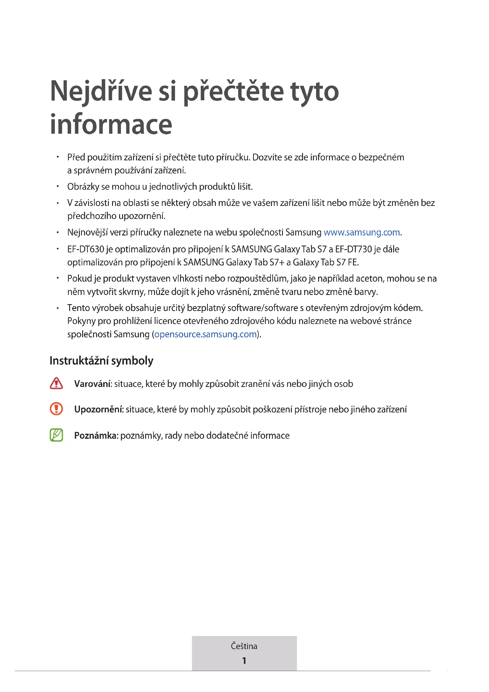 Tento výrobek obsahuje určitý bezplatný software/software s otevřeným zdrojovým kódem. Pokyny pro prohlížení licence otevřeného zdrojového kódu naleznete na webové stránce společnosti Samsung (opensource.samsung.com). Instruktážní symboly Varování: situace, které by mohly způsobit zranění vás nebo jiných osob Upozornění: situace, které by mohly způsobit poškození přístroje nebo jiného zařízení Poznámka: poznámky, rady nebo dodatečné informace2