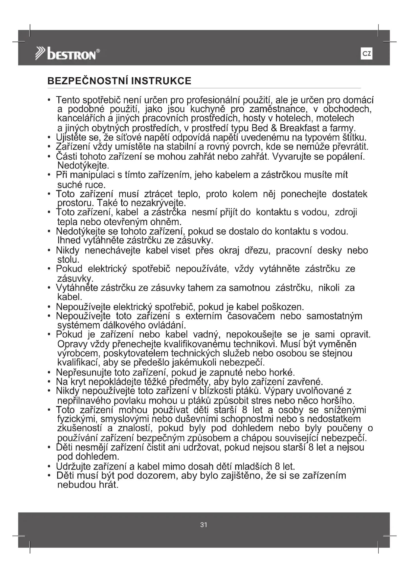 - Vaše obec vám může sdělit, kde ve vaší oblasti najdete určené sběrné místo odpadu. PRÁCE V nepravděpodobném případě poruchy kontaktujte zákaznický servis Bestron: www.bestron.com/service