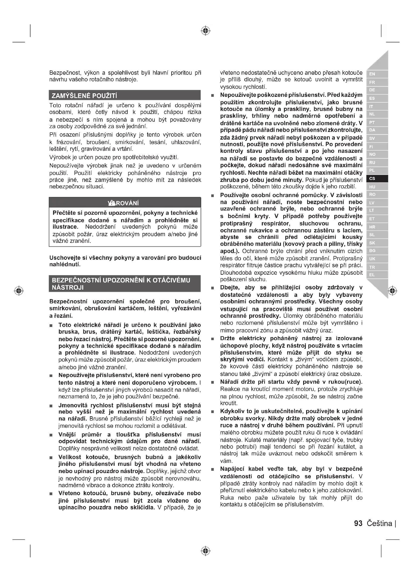 Toto rotační nářadí je určeno k používání dospělými osobami, které četly návod k použití, chápou rizika a nebezpečí s ním spojená a mohou být považovány za osoby zodpovědné za své jednání. Při osazení příslušnými doplňky je tento výrobek určen k frézování, broušení, smirkování, tesání, uhlazování, leštění, rytí, gravírování a vrtání. Výrobek je určen pouze pro spotřebitelské využití. Nepoužívejte výrobek jinak než je uvedeno v určeném použití. Použití elektricky poháněného nástroje pro práce jiné, než zamýšlené by mohlo mít za následek nebezpečnou situaci. VAROVÁNÍ Přečtěte si pozorně upozornění, pokyny a technické specifikace dodané s nářadím a prohlédněte si ilustrace. Nedodržení uvedených pokynů může způsobit požár, úraz elektrickým proudem a/nebo jiné vážné zranění. Uschovejte si všechny pokyny a varování pro budoucí nahlédnutí. BEZPEČNOSTNÍ UPOZORNĚNÍ K OTÁČIVÉMU NÁSTROJI Bezpečnostní upozornění společné pro broušení, smirkování, obrušování kartáčem, leštění, vyřezávání a řezání. ■ Toto elektrické nářadí je určeno k používání jako bruska, brus, drátěný kartáč, leštička, řezbářský nebo řezací nástroj. Přečtěte si pozorně upozornění, pokyny a technické specifikace dodané s nářadím a prohlédněte si ilustrace. Nedodržení uvedených pokynů může způsobit požár, úraz elektrickým proudem a/nebo jiné vážné zranění. ■ Nepoužívejte příslušenství, které není vyrobeno pro tento nástroj a které není doporučeno výrobcem. I když lze příslušenství jiných výrobců nasadit na nářadí, neznamená to, že je jeho používání bezpečné. ■ Jmenovitá rychlost příslušenství musí být stejná nebo vyšší než je maximální rychlost uvedená na nářadí. Brusné příslušenství běžící rychleji než je jmenovitá rychlost se mohou rozlomit a odlétávat. ■ Vnější průměr a tloušťka příslušenství musí odpovídat technickým údajům pro dané nářadí. Doplňky nesprávné velikosti nelze dostatečně ovládat. ■ Velikost kotouče, brusných bubnů a jakékoliv jiného příslušenství musí být vhodná na vřeteno nebo upínací pouzdro nástroje. Doplňky, jejichž otvor je nevhodný pro nástroj může způsobit nerovnováhu, nadměrné vibrace a dokonce ztrátu kontroly. ■ Vřeteno kotoučů, brusné bubny, ořezávače nebo jiné příslušenství musí být zcela vloženo do upínacího pouzdra nebo sklíčidla. V případě, že je vřeteno nedostatečně uchyceno anebo přesah kotouče je příliš dlouhý, může se kotouč uvolnit a vymrštit vysokou rychlostí. ■ Nepoužívejte poškozené příslušenství. Před každým použitím zkontrolujte příslušenství, jako brusné kotouče na úlomky a praskliny, brusné bubny na praskliny, trhliny nebo nadměrné opotřebení a drátěné kartáče na uvolněné nebo zlomené dráty. V případě pádu nářadí nebo příslušenství zkontrolujte, zda žádný prvek nářadí nebyl poškozen a v případě nutnosti, použijte nové příslušenství. Po provedení kontroly stavu příslušenství a po jeho nasazení na nářadí se postavte do bezpečné vzdálenosti a počkejte, dokud nářadí nedosáhne své maximální rychlosti. Nechte nářadí běžet na maximální otáčky zhruba po dobu jedné minuty. Pokud je příslušenství poškozené, během této zkoušky dojde k jeho rozbití. ■ Používejte osobní ochranné pomůcky. V závislosti na používání nářadí, noste bezpečnostní nebo uzavřené ochranné brýle, nebo ochranné brýle s bočními kryty. V případě potřeby používejte protiprašný respirátor, sluchovou ochranu, ochranné rukavice a ochrannou zástěru s laclem, abyste se chránili před odlétajícími kousky obráběného materiálu (kovový prach a piliny, třísky apod.). Ochranné brýle chrání před vniknutím cizích těles do očí, které může způsobit zranění. Protiprašný respirátor filtruje částice prachu vytvářející se při práci. Dlouhodobá expozice vysokému hluku může způsobit poškození sluchu. ■ Dbejte, aby se přihlížející osoby zdržovaly v dostatečné vzdálenosti a aby byly vybaveny osobními ochrannými prostředky. Všechny osoby vstupující na pracoviště musí používat osobní ochranné prostředky. Úlomky obráběného materiálu nebo rozlomené příslušenství může být vymrštěno i mimo pracovní zónu a způsobit vážný úraz. ■ Držte elektricky poháněný nástroj za izolované úchopové plochy, když nástroj používáte s vrtacím příslušenstvím, které může přijít do styku se skrytými vodiči. Kontakt s „živým“ vodičem způsobí, že kovové části elektricky poháněného nástroje se stanou také „živými“ a způsobí elektrický úraz obsluze. ■ Nářadí držte při startu vždy pevně v rukou(ruce). Reakce na kroutící moment motoru, protože zrychluje na plnou rychlost, může způsobit, že se nástroj začne kroutit. ■ Kdykoliv to je uskutečnitelné, používejte k upínání obrobku svorky. Nikdy držte malý obrobek v jedné ruce a nástroj v druhé během používání. Při upnutí malého obrobku můžete použít ruku či ruce k ovládání nástroje. Kulaté materiály (např. spojovací tyče, trubky nebo potrubí) mají tendenci se při řezání kutálet, a nástroj tak může uváznout nebo odskočit směrem k vám. ■ Napájecí kabel veďte tak, aby byl v bezpečné vzdálenosti od otáčejícího se příslušenství. V případě ztráty kontroly nad nářadím by mohlo dojít k přeříznutí elektrického kabelu nebo k jeho zablokování. Ruka nebo paže uživatele by tak mohly přijít do kontaktu s otáčejícím se příslušenstvím.94 | Čeština ■ Nikdy nepokládejte nářadí, pokud se příslu