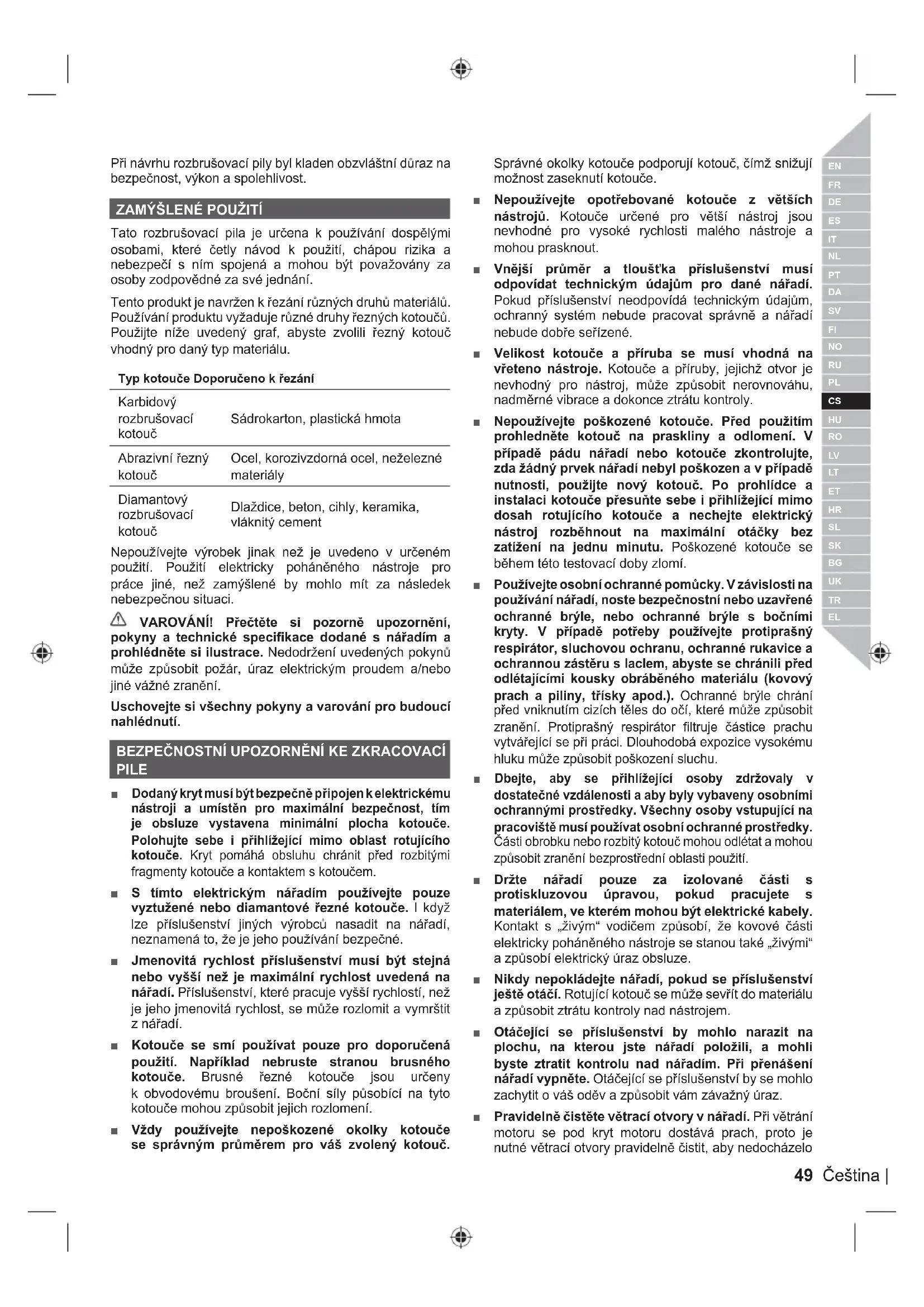 Tato rozbrušovací pila je určena k používání dospělými osobami, které četly návod k použití, chápou rizika a nebezpečí s ním spojená a mohou být považovány za osoby zodpovědné za své jednání. Tento produkt je navržen k řezání různých druhů materiálů. Používání produktu vyžaduje různé druhy řezných kotoučů. Použijte níže uvedený graf, abyste zvolili řezný kotouč vhodný pro daný typ materiálu. Typ kotouče Doporučeno k řezání Karbidový rozbrušovací kotouč Sádrokarton, plastická hmota Abrazivní řezný kotouč Ocel, korozivzdorná ocel, neželezné materiály Diamantový rozbrušovací kotouč Dlaždice, beton, cihly, keramika, vláknitý cement Nepoužívejte výrobek jinak než je uvedeno v určeném použití. Použití elektricky poháněného nástroje pro práce jiné, než zamýšlené by mohlo mít za následek nebezpečnou situaci. VAROVÁNÍ! Přečtěte si pozorně upozornění, pokyny a technické specifikace dodané s nářadím a prohlédněte si ilustrace. Nedodržení uvedených pokynů může způsobit požár, úraz elektrickým proudem a/nebo jiné vážné zranění. Uschovejte si všechny pokyny a varování pro budoucí nahlédnutí.