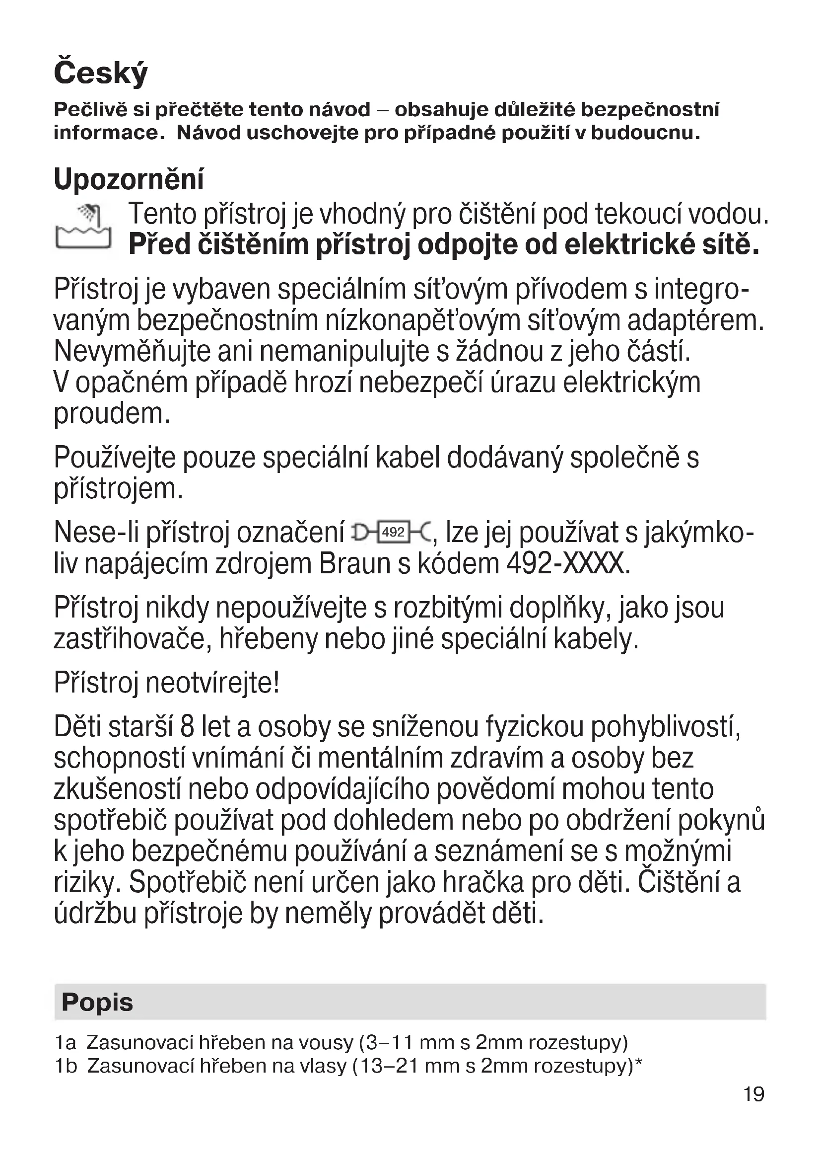 , lze jej používat s jakýmko- liv napájecím zdrojem Braun s kódem 492-XXXX. Přístroj nikdy nepoužívejte s rozbitými doplňky, jako jsou zastřihovače, hřebeny nebo jiné speciální kabely. Přístroj neotvírejte! Děti starší 8 let a osoby se sníženou fyzickou pohyblivostí, schopností vnímání či mentálním zdravím a osoby bez zkušeností nebo odpovídajícího povědomí mohou tento spotřebič používat pod dohledem nebo po obdržení pokynů k jeho bezpečnému používání a seznámení se s možnými riziky. Spotřebič není určen jako hračka pro děti. Čištění a údržbu přístroje by neměly provádět děti. Popis 1a Zasunovací hřeben na vousy (3–11 mm s 2mm rozestupy) 1b Zasunovací hřeben na vlasy (13–21 mm s 2mm rozestupy)* 90618559_MGK7221_7220_7920_MGK5280_CEEMEA.indd 1990618559_MGK7221_7220_7920_MGK5280_CEEMEA.indd 19 21.05.19 10:2921.05.19 10:29 Business Use - P&G AUTHORIZED POA-00133196 Rev 001 Effective Date 2019-05-24 Printed 2022-03-31 Page 19 of 8020 1c Tlačítko pro uvolnění zasunovacích hřebenů 1d Pevný hřeben 1 (1 mm)* 1e Pevný hřeben 2 (2 mm)* 2a Hlava zastřihovače 2b Hlava zastřihovače chloupků v nose a uších 2c Přesná hlava zastřihovače* 2d Hlava nástavce pro péči o tělo* 2e Mini zastřihovací hlava* 3 Vypínač (on/off) 4 Kontrolka nabíjení baterie 5 Napájecí zdířka 6 Speciální síťový přívod (design se může lišit) 7 Nabíjecí stojan*