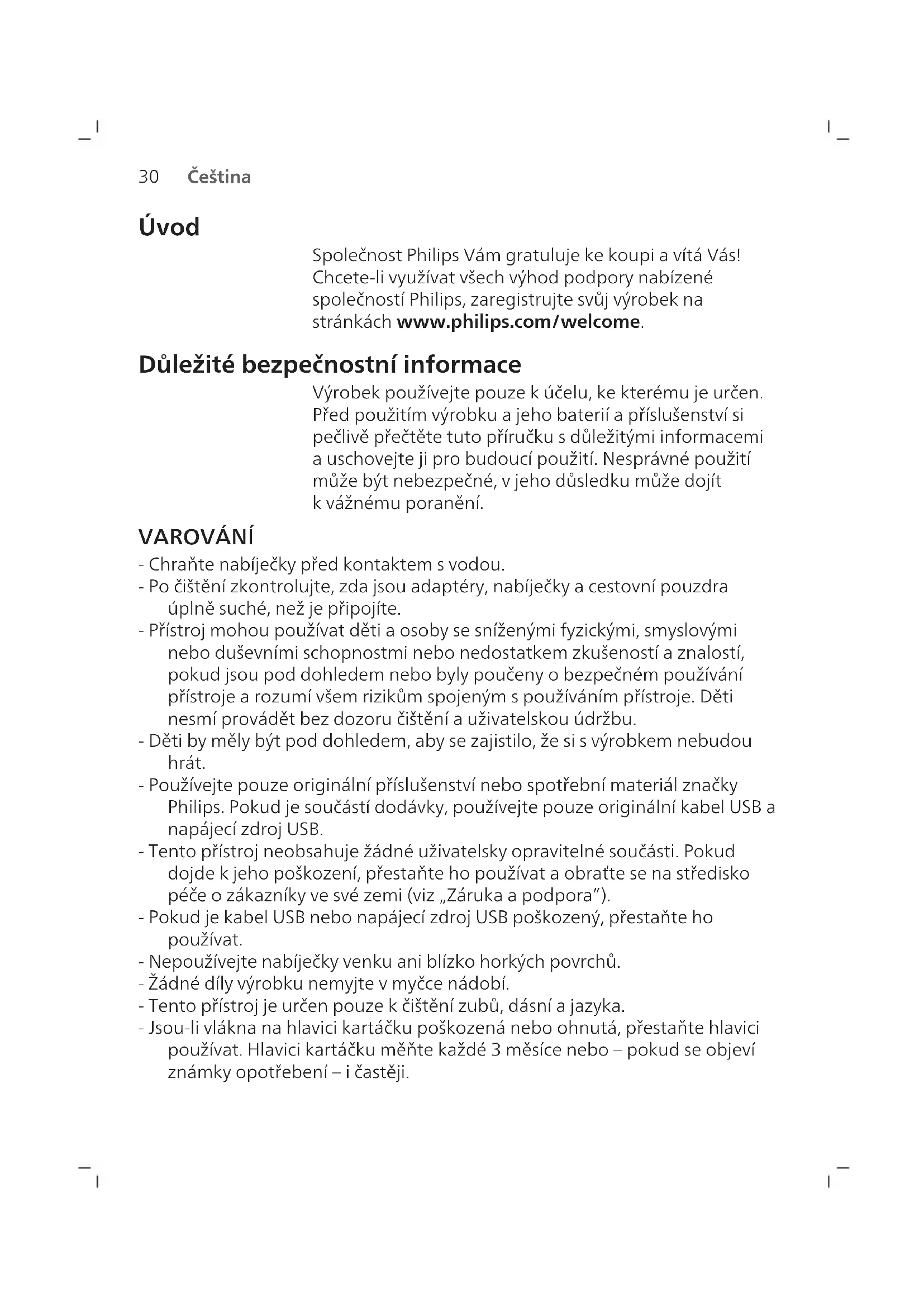 Čeština Úvod Společnost Philips Vám gratuluje ke koupi a vítá Vás! Chcete-li využívat všech výhod podpory nabízené společností Philips, zaregistrujte svůj výrobek na stránkách www.philips.com/welcome. Důležité bezpečnostní informace Výrobek používejte pouze kúčelu, ke kterému je určen. Před použitím výrobku ajeho baterií apříslušenství si pečlivě přečtěte tuto příručku sdůležitými informacemi auschovejte ji pro budoucí použití. Nesprávné použití může být nebezpečné, vjeho důsledku může dojít kvážnému poranění. VAROVÁNÍ - Chraňte nabíječky před kontaktem svodou. - Po čištění zkontrolujte, zda jsou adaptéry, nabíječky a cestovní pouzdra úplně suché, než je připojíte. - Přístroj mohou používat děti a osoby se sníženými fyzickými, smyslovými nebo duševními schopnostmi nebo nedostatkem zkušeností a znalostí, pokud jsou pod dohledem nebo byly poučeny obezpečném používání přístroje a rozumí všem rizikům spojeným spoužíváním přístroje. Děti nesmí provádět bez dozoru čištění auživatelskou údržbu. - Děti by měly být pod dohledem, aby se zajistilo, že si svýrobkem nebudou hrát. - Používejte pouze originální příslušenství nebo spotřební materiál značky Philips. Pokud je součástí dodávky, používejte pouze originální kabel USB a napájecí zdroj USB. - Tento přístroj neobsahuje žádné uživatelsky opravitelné součásti. Pokud dojde kjeho poškození, přestaňte ho používat a obraťte se na středisko péče ozákazníky ve své zemi (viz „Záruka apodpora”). - Pokud je kabel USB nebo napájecí zdroj USB poškozený, přestaňte ho používat. - Nepoužívejte nabíječky venku aniblízko horkých povrchů. - Žádné díly výrobku nemyjte vmyčce nádobí. - Tento přístroj je určen pouze kčištění zubů, dásní ajazyka. - Jsou-li vlákna na hlavici kartáčku poškozená nebo ohnutá, přestaňte hlavici používat. Hlavici kartáčku měňte každé 3měsíce nebo – pokud se objeví známky opotřebení – ičastěji.31 Čeština - Produkt nesmí přijít do přímého kontaktu sprodukty, které obsahují esenciální oleje nebo kokosový olej. Kontakt může způsobit uvolnění vláken.