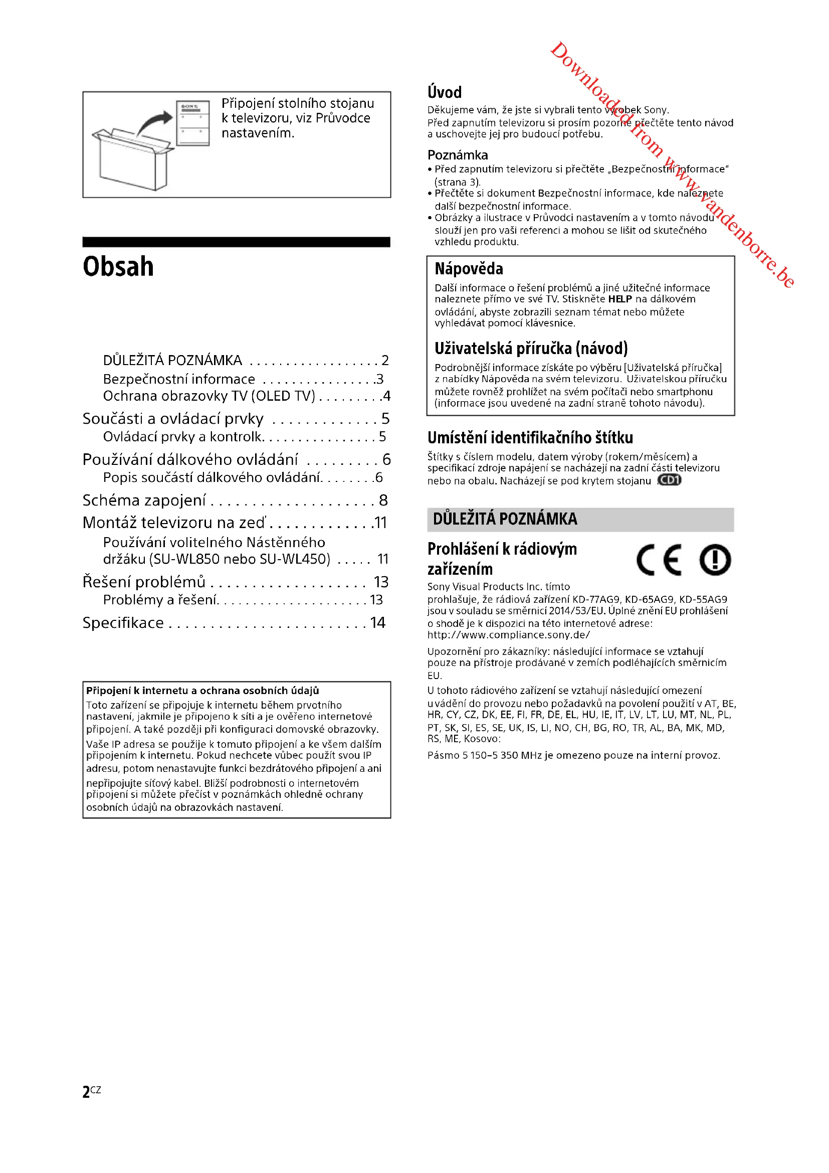 - Před zapnutím televizoru si přečtěte „Bezpečnostní informace“ (strana 3). • Přečtěte si dokument Bezpečnostní informace, kde naleznete další bezpečnostní informace.• Obrázky a ilustrace v Průvodci nastavením a v tomto návodu slouží jen pro vaši referenci a mohou se lišit od skutečného vzhledu produktu. Umístění identifikačního štítku Štítky s číslem modelu, datem výroby (rokem/měsícem) a specifikací zdroje napájení se nacházejí na zadní části televizoru nebo na obalu. Nacházejí se pod krytem stojanu . Prohlášení k rádiovým zařízením Sony Visual Products Inc. tímto prohlašuje, že rádiová zařízení KD-77AG9, KD-65AG9, KD-55AG9 jsou v souladu se směrnicí 2014/53/EU. Úplné znění EU prohlášení o shodě je k dispozici na této internetové adrese: http://www.compliance.sony.de/Upozornění pro zákazníky: následující informace se vztahují pouze na přístroje prodávané v zemích podléhajících směrnicím EU. U tohoto rádiového zařízení se vztahují následující omezení vádění do provozu nebo požadavků na povolení použití v AT, BE, HR, CY, CZ, DK, EE, FI, FR, DE, EL, HU, IE, IT, LV, LT, LU, MT, NL, PL, PT, SK, SI, ES, SE, UK, IS, LI, NO, CH, BG, RO, TR, AL, BA, MK, MD, RS, ME, Kosovo:Pásmo 5 150–5 350 MHz je omezeno pouze na interní provoz.Připojení stolního stojanu k televizoru, viz Průvodce stavením.Připojení k internetu a ochrana osobních údajůToto zařízení se připojuje k internetu během prvotního nastavení, jakmile je připojeno k síti a je ověřeno internetové připojení. A také později při konfiguraci domovské obrazovky. Vaše IP adresa se použije k tomuto připojení a ke všem dalším připojením k internetu. Pokud nechcete vůbec použít svou IP adresu, potom nenastavujte funkci bezdrátového připojení a ani nepřipojujte síťový kabel. Bližší podrobnosti o internetovém připojení si můžete přečíst v poznámkách ohledně ochrany osobních údajů na obrazovkách nastavení. Nápověda Další informace o řešení problémů a jiné užitečné informace naleznete přímo ve své TV. Stiskněte HELP na dálkovém ovládání, abyste zobrazili seznam témat nebo můžete vyhledávat pomocí klávesnice. Uživatelská příručka (návod) Podrobnější informace získáte po výběru [Uživatelská příručka] z nabídky Nápověda na svém televizoru. Uživatelskou příručku můžete rovněž prohlížet na svém počítači nebo smartphonu (informace jsou uvedené na zadní straně tohoto návodu).