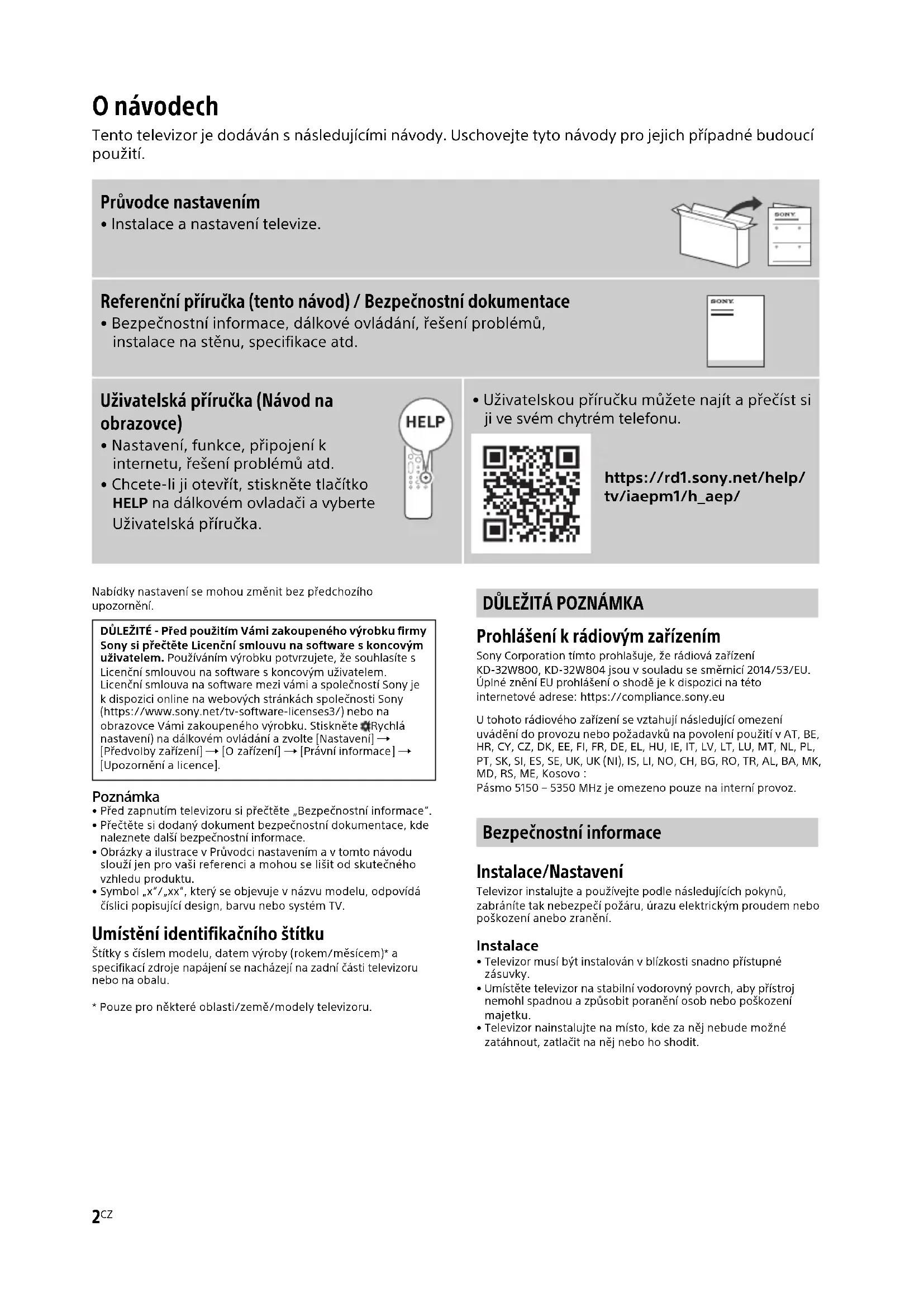 - Pouze pro některé oblasti/země/modely televizoru. Prohlášení k rádiovým zařízením Sony Corporation tímto prohlašuje, že rádiová zařízení KD-32W800, KD-32W804 jsou v souladu se směrnicí 2014/53/EU. Úplné znění EU prohlášení o shodě je k dispozici na této internetové adrese: https://compliance.sony.eu U tohoto rádiového zařízení se vztahují následující omezení uvádění do provozu nebo požadavků na povolení použití v AT, BE, HR, CY, CZ, DK, EE, FI, FR, DE, EL, HU, IE, IT, LV, LT, LU, MT, NL, PL, PT, SK, SI, ES, SE, UK, UK (NI), IS, LI, NO, CH, BG, RO, TR, AL, BA, MK, MD, RS, ME, Kosovo : Pásmo 5150 – 5350 MHz je omezeno pouze na interní provoz. Instalace/Nastavení Televizor instalujte a používejte podle následujících pokynů, zabráníte tak nebezpečí požáru, úrazu elektrickým proudem nebo poškození anebo zranění. Instalace