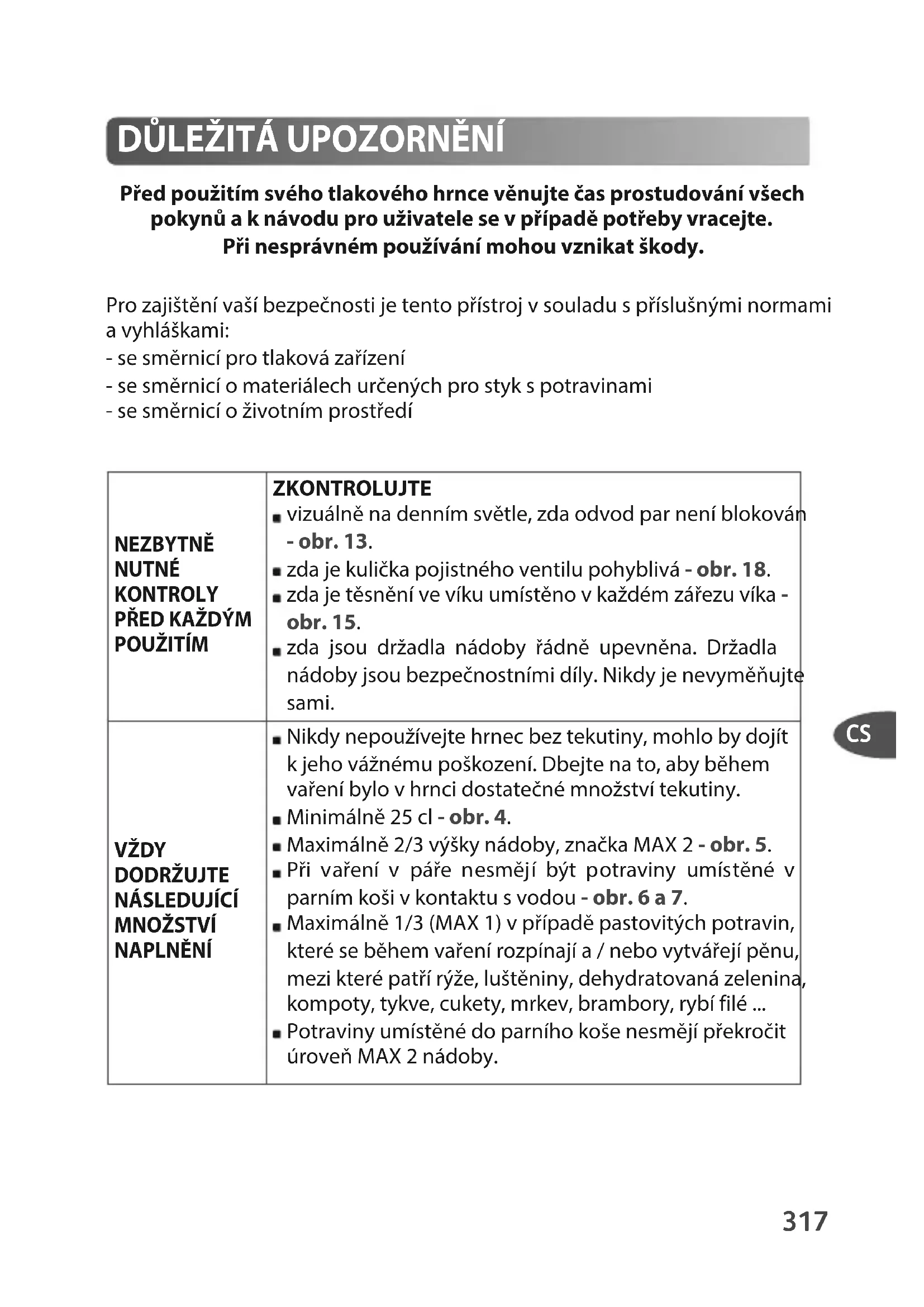 Před použitím svého tlakového hrnce věnujte čas prostudování všech pokynů a k návodu pro uživatele se v případě potřeby vracejte. Při nesprávném používání mohou vznikat škody. Pro zajištění vaší bezpečnosti je tento přístroj v souladu s příslušnými normami a vyhláškami: - se směrnicí pro tlaková zařízení - se směrnicí o materiálech určených pro styk s potravinami - se směrnicí o životním prostředí