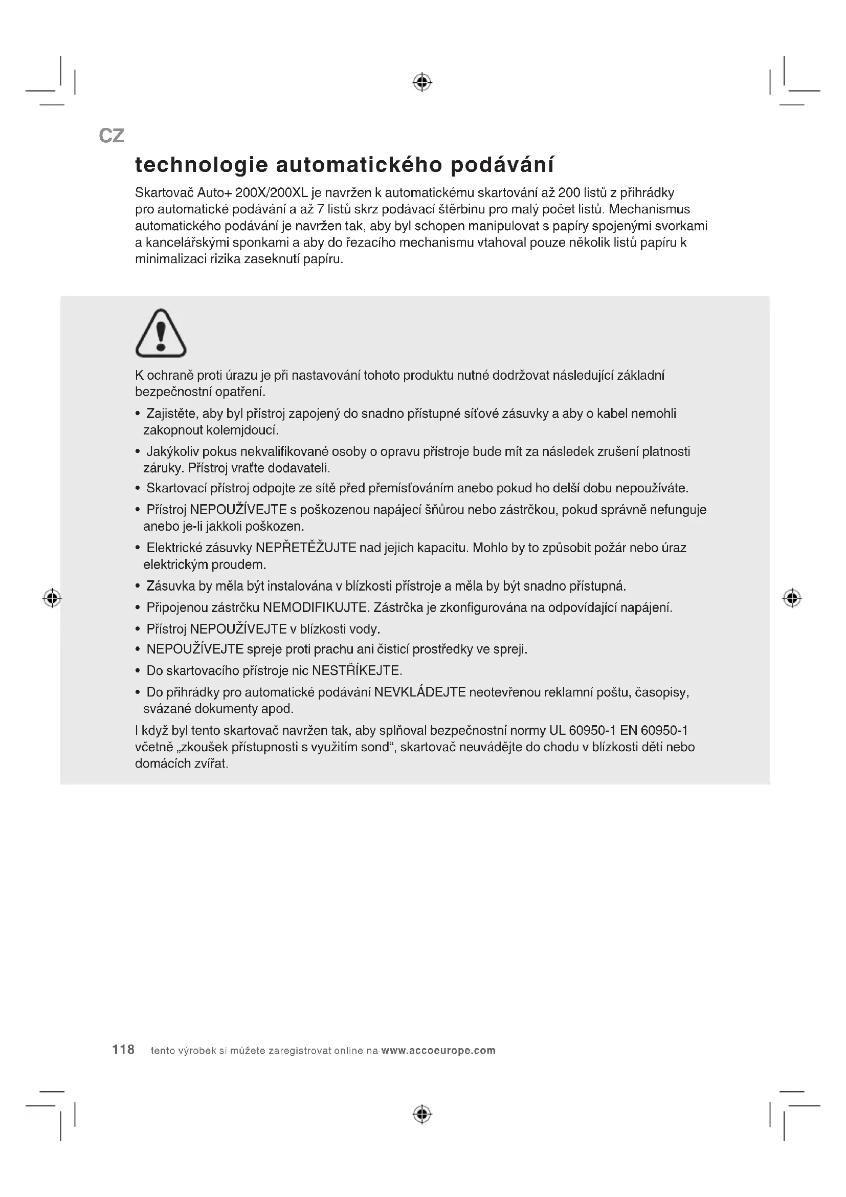 - Do přihrádky pro automatické podávání NEVKLÁDEJTE neotevřenou reklamní poštu, časopisy, svázané dokumenty apod. I když byl tento skartovač navržen tak, aby splňoval bezpečnostní normy UL 60950-1 EN 60950-1 včetně „zkoušek přístupnosti s využitím sond“, skartovač neuvádějte do chodu v blízkosti dětí nebo domácích zvířat. technologie automatického podávání Skartovač Auto+ 200X/200XL je navržen k automatickému skartování až 200 listů z přihrádky pro automatické podávání a až 7 listů skrz podávací štěrbinu pro malý počet listů. Mechanismus automatického podávání je navržen tak, aby byl schopen manipulovat s papíry spojenými svorkami a kancelářskými sponkami a aby do řezacího mechanismu vtahoval pouze několik listů papíru k minimalizaci rizika zaseknutí papíru.AUTO+ 200X&200XL