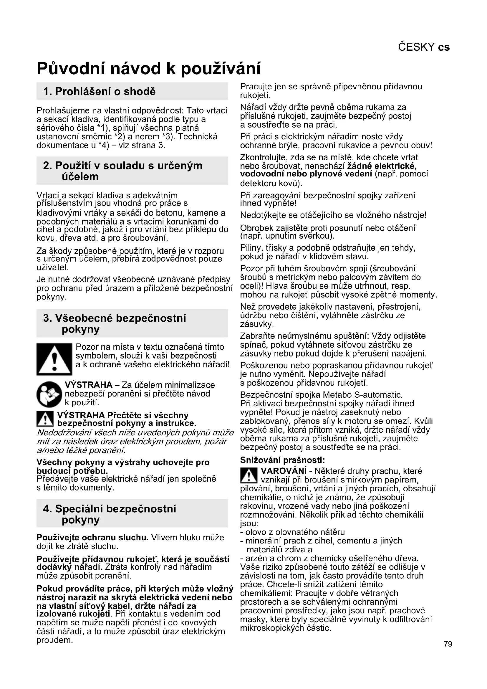 Prohlašujeme na vlastní odpovědnost: Tato vrtací a sekací kladiva, identifikovaná podle typu a sériového čísla *1), splňují všechna platná ustanovení směrnic *2) a norem *3). Technická dokumentace u *4) – viz strana 3. Vrtací a sekací kladiva s adekvátním příslušenstvím jsou vhodná pro práce s kladivovými vrtáky a sekáči do betonu, kamene a podobných materiálů a s vrtacími korunkami do cihel a podobně, jakož i pro vrtání bez příklepu do kovu, dřeva atd. a pro šroubování. Za škody způsobené použitím, které je v rozporu s určeným účelem, přebírá zodpovědnost pouze uživatel. Je nutné dodržovat všeobecně uznávané předpisy pro ochranu před úrazem a přiložené bezpečnostní pokyny. Pozor na místa v textu označená tímto symbolem, slouží k vaší bezpečnosti a k ochraně vašeho elektrického nářadí! VÝSTRAHA – Za účelem minimalizace nebezpečí poranění si přečtěte návod k použití. VÝSTRAHA Přečtěte si všechny bezpečnostní pokyny a instrukce. Nedodržování všech níže uvedených pokynů může mít za následek úraz elektrickým proudem, požár a/nebo těžké poranění. Všechny pokyny a výstrahy uchovejte pro budoucí potřebu. Předávejte vaše elektrické nářadí jen společně s těmito dokumenty. Používejte ochranu sluchu. Vlivem hluku může dojít ke ztrátě sluchu. Používejte přídavnou rukojeť, která je součástí dodávky nářadí. Ztráta kontroly nad nářadím může způsobit poranění. Pokud provádíte práce, při kterých může vložný nástroj narazit na skrytá elektrická vedení nebo na vlastní síťový kabel, držte nářadí za izolované rukojeti. Při kontaktu s vedením pod napětím se může napětí přenést i do kovových částí nářadí, a to může způsobit úraz elektrickým proudem. Pracujte jen se správně připevněnou přídavnou rukojetí. Nářadí vždy držte pevně oběma rukama za příslušné rukojeti, zaujměte bezpečný postoj a soustřeďte se na práci. Při práci s elektrickým nářadím noste vždy ochranné brýle, pracovní rukavice a pevnou obuv! Zkontrolujte, zda se na místě, kde chcete vrtat nebo šroubovat, nenachází žádné elektrické, vodovodní nebo plynové vedení (např. pomocí detektoru kovů). Při zareagování bezpečnostní spojky zařízení ihned vypněte! Nedotýkejte se otáčejícího se vložného nástroje! Obrobek zajistěte proti posunutí nebo otáčení (např. upnutím svěrkou). Piliny, třísky a podobně odstraňujte jen tehdy, pokud je nářadí v klidovém stavu. Pozor při tuhém šroubovém spoji (šroubování šroubů s metrickým nebo palcovým závitem do oceli)! Hlava šroubu se může utrhnout, resp. mohou na rukojeť působit vysoké zpětné momenty. Než provedete jakékoliv nastavení, přestrojení, údržbu nebo čištění, vytáhněte zástrčku ze zásuvky. Zabraňte neúmyslnému spuštění: Vždy odjistěte spínač, pokud vytáhnete síťovou zástrčku ze zásuvky nebo pokud dojde k přerušení napájení. Poškozenou nebo popraskanou přídavnou rukojeť je nutno vyměnit. Nepoužívejte nářadí s poškozenou přídavnou rukojetí. Bezpečnostní spojka Metabo S-automatic. Při aktivaci bezpečnostní spojky nářadí ihned vypněte! Pokud je nástroj zaseknutý nebo zablokovaný, přenos síly k motoru se omezí. Kvůli vysoké síle, která přitom vzniká, držte nářadí vždy oběma rukama za příslušné rukojeti, zaujměte bezpečný postoj a soustřeďte se na práci. Snižování prašnosti: VAROVÁNÍ - Některé druhy prachu, které vznikají při broušení smirkovým papírem, pilování, broušení, vrtání a jiných pracích, obsahují chemikálie, o nichž je známo, že způsobují rakovinu, vrozené vady nebo jiná poškození rozmnožování. Několik příklad těchto chemikálií jsou: - olovo z olovnatého nátěru - minerální prach z cihel, cementu a jiných materiálů zdiva a - arzén a chrom z chemicky ošetřeného dřeva. Vaše riziko způsobené touto zátěží se odlišuje v závislosti na tom, jak často provádíte tento druh práce. Chcete-li snížit zatížení těmito chemikáliemi: Pracujte v dobře větraných prostorech a se schválenými ochrannými pracovními prostředky, jako jsou např. prachové masky, které byly speciálně vyvinuty k odfiltrování mikroskopických částic. Původní návod k používání