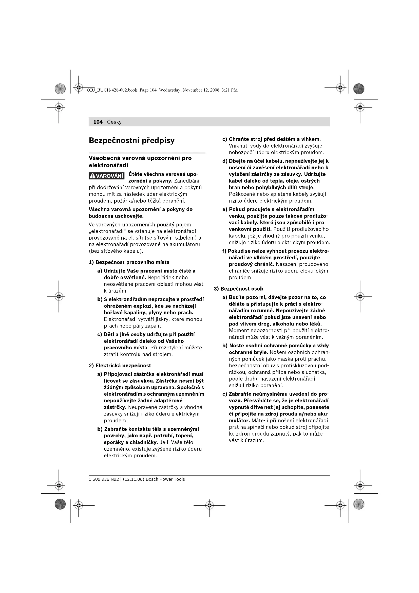 a) Buďte pozorní, dávejte pozor na to, co děláte a přistupujte k práci s elektro- nářadím rozumně. Nepoužívejte žádné elektronářadí pokud jste unaveni nebo pod vlivem drog, alkoholu nebo léků. Moment nepozornosti při použití elektro- nářadí může vést k vážným poraněním. b) Noste osobní ochranné pomůcky a vždy ochranné brýle. Nošení osobních ochran- ných pomůcek jako maska proti prachu, bezpečnostní obuv s protiskluzovou pod- rážkou, ochranná přilba nebo sluchátka, podle druhu nasazení elektronářadí, snižují riziko poranění. c) Zabraňte neúmyslnému uvedení do pro- vozu. Přesvědčte se, že je elektronářadí vypnuté dříve než jej uchopíte, ponesete či připojíte na zdroj proudu a/nebo aku- mulátor. Máte-li při nošení elektronářadí prst na spínači nebo pokud stroj připojíte ke zdroji proudu zapnutý, pak to může vést k úrazům. VAROVÁNÍ OBJ_BUCH-428-002.book Page 104 Wednesday, November 12, 2008 3:21 PMČesky | 105 Bosch Power Tools 1 609 929 N92 | (12.11.08) d) Než elektronářadí zapnete, odstraňte seřizovací nástroje nebo šroubováky. Nástroj nebo klíč, který se nachází v otá- čivém dílu stroje, může vést k poranění. e) Vyvarujte se abnormálního držení těla. Zajistěte si bezpečný postoj a udržujte vždy rovnováhu. Tím můžete elektro- nářadí v neočekávaných situacích lépe kontrolovat. f) Noste vhodný oděv. Nenoste žádný volný oděv nebo šperky. Vlasy, oděv a rukavice udržujte daleko od pohybují- cích se dílů. Volný oděv, šperky nebo dlouhé vlasy mohou být zachyceny pohy- bujícími se díly. g) Lze-li namontovat odsávací či zachycující přípravky, přesvědčte se, že jsou připo- jeny a správně použity. Použití odsávání prachu může snížit ohrožení prachem.