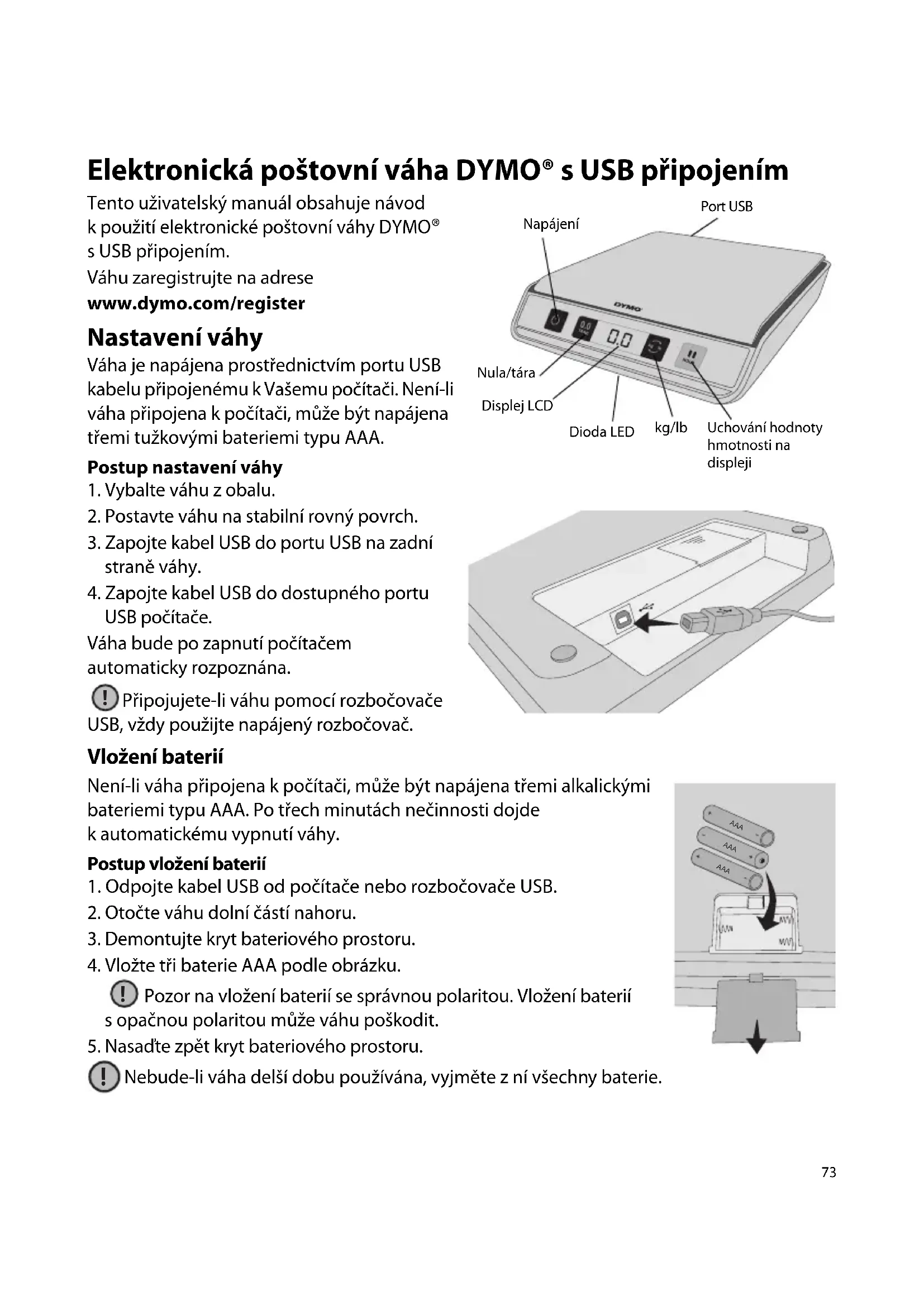 Nastavení váhy Váha je napájena prostřednictvím portu USB kabelu připojenému k Vašemu počítači. Není-li váha připojena k počítači, může být napájena třemi tužkovými bateriemi typu AAA.Postup nastavení váhy1. Vybalte váhu z obalu.2. Postavte váhu na stabilní rovný povrch.3. Zapojte kabel USB do portu USB na zadní straně váhy.4. Zapojte kabel USB do dostupného portu USB počítače.Váha bude po zapnutí počítačem automaticky rozpoznána.Připojujete-li váhu pomocí rozbočovače USB, vždy použijte napájený rozbočovač.Vložení bateriíNení-li váha připojena k počítači, může být napájena třemi alkalickými bateriemi typu AAA. Po třech minutách nečinnosti dojde k automatickému vypnutí váhy.Postup vložení baterií1. Odpojte kabel USB od počítače nebo rozbočovače USB.2. Otočte váhu dolní částí nahoru.3. Demontujte kryt bateriového prostoru.4. Vložte tři baterie AAA podle obrázku.Pozor na vložení baterií se správnou polaritou. Vložení baterií s opačnou polaritou může váhu poškodit.5. Nasaďte zpět kryt bateriového prostoru. Nebude-li váha delší dobu používána, vyjměte z ní všechny baterie. Napájení Displej LCDkg/lbUchování hodnoty hmotnosti na displejiNula/táraPort USBDioda LED