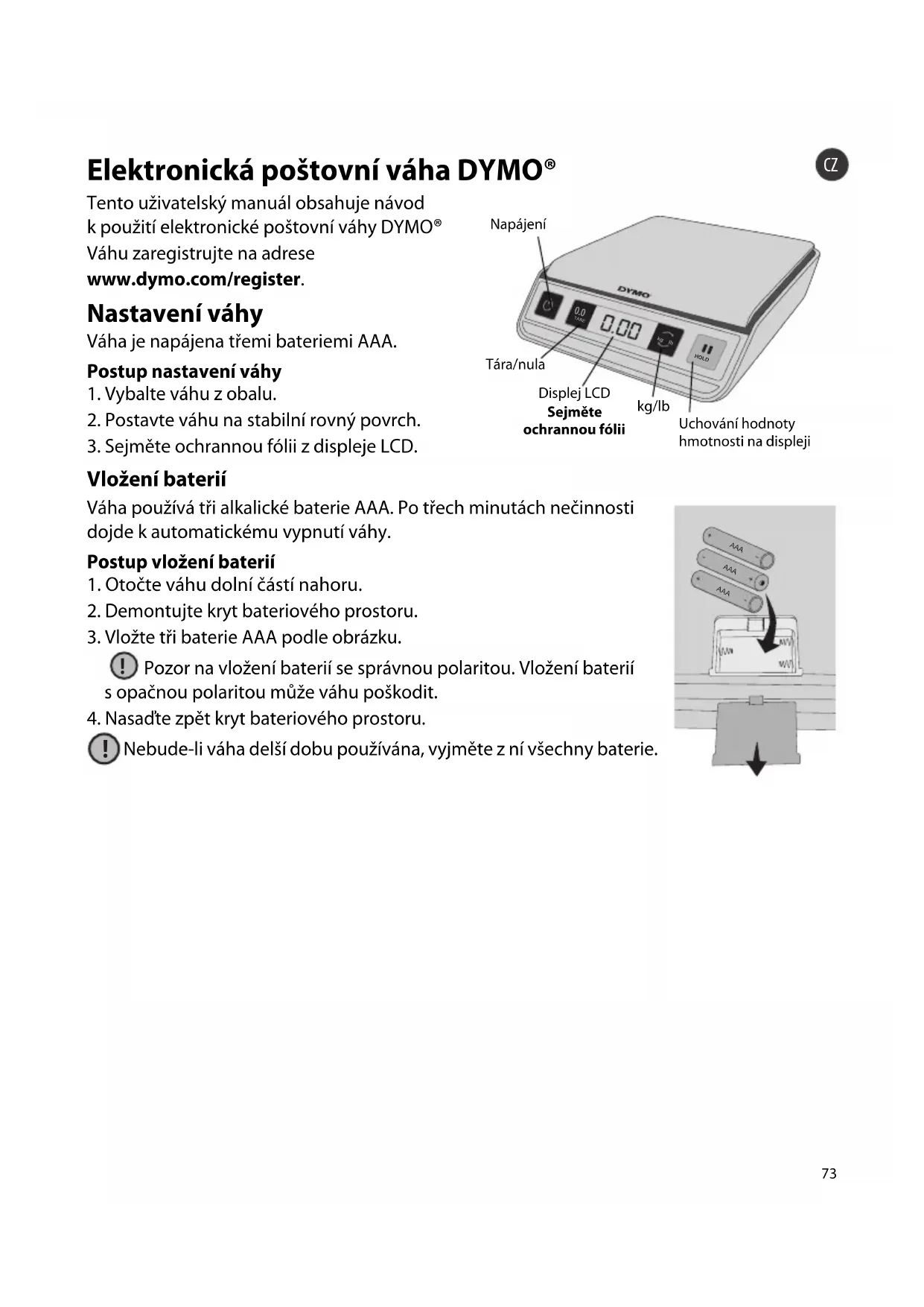 Váhu zaregistrujte na adrese www.dymo.com/register. Nastavení váhy Váha je napájena třemi bateriemi AAA. Postup nastavení váhy