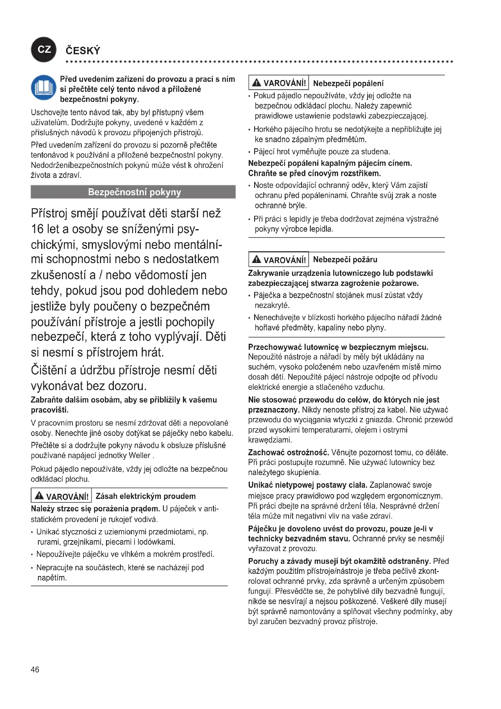 Před uvedením zařízení do provozu a prací s ním si přečtěte celý tento návod a přiložené bezpečnostní pokyny. Uschovejte tento návod tak, aby byl přístupný všem uživatelům. Dodržujte pokyny, uvedené v každém z příslušných návodů k provozu připojených přístrojů. Před uvedením zařízení do provozu si pozorně přečtěte tentonávod k používání a přiložené bezpečnostní pokyny. Nedodrženíbezpečnostních pokynů může vést k ohrožení života a zdraví. Bezpečnostní pokyny Přístroj smějí používat děti starší než 16 let a osoby se sníženými psy- chickými, smyslovými nebo mentální- mi schopnostmi nebo s nedostatkem zkušeností a / nebo vědomostí jen tehdy, pokud jsou pod dohledem nebo jestliže byly poučeny o bezpečném používání přístroje a jestli pochopily nebezpečí, která z toho vyplývají. Děti si nesmí s přístrojem hrát. Čištění a údržbu přístroje nesmí děti vykonávat bez dozoru. Zabraňte dalším osobám, aby se přiblížily k vašemu pracovišti. V pracovním prostoru se nesmí zdržovat děti a nepovolané osoby. Nenechte jiné osoby dotýkat se páječky nebo kabelu. Přečtěte si a dodržujte pokyny návodu k obsluze příslušné používané napájecí jednotky Weller . Pokud pájedlo nepoužíváte, vždy jej odložte na bezpečnou odkládací plochu. VAROVÁNÍ! Zásah elektrickým proudem Należy strzec się porażenia prądem. U páječek v anti- statickém provedení je rukojeť vodivá.