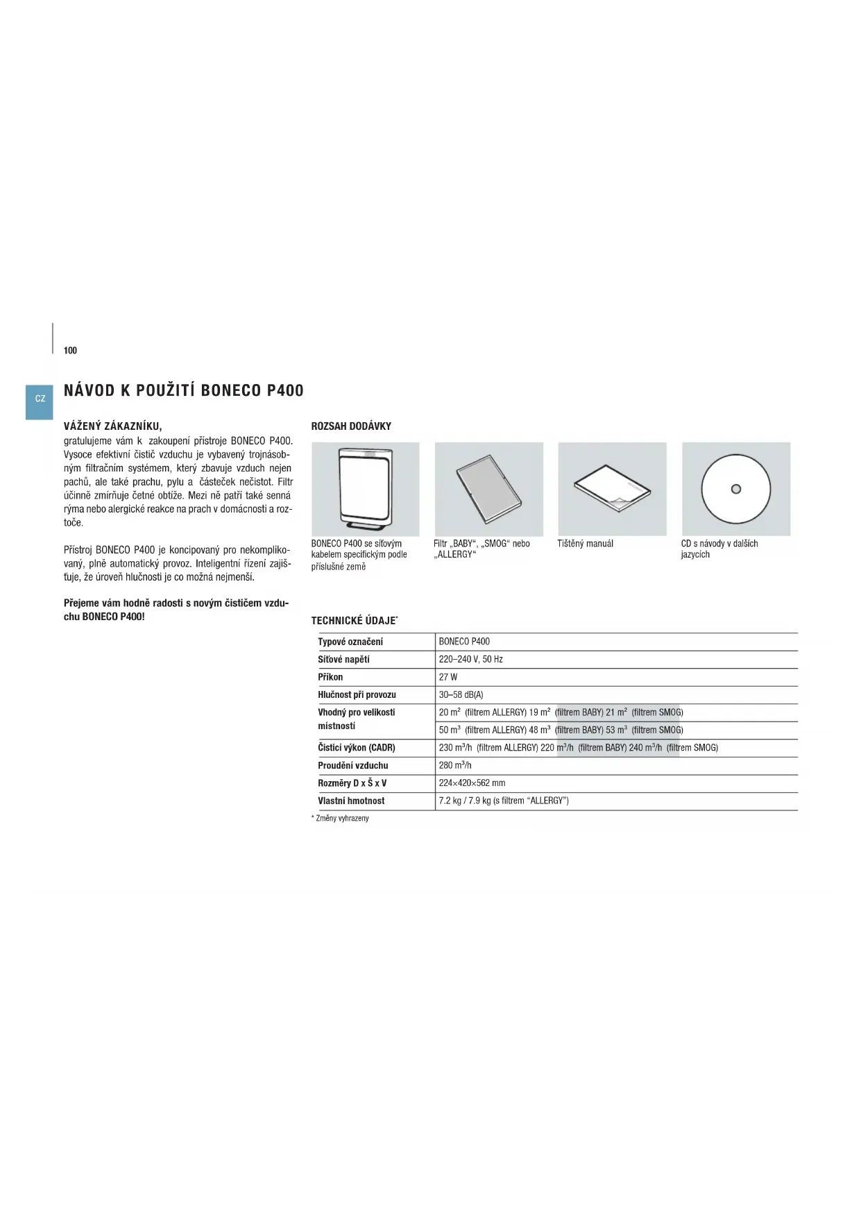 BONECO P400 se síťovým kabelem specifickým podle příslušné země Filtr „BABY“, „SMOG“ nebo „ALLERGY“ CD snávody vdalších jazycích