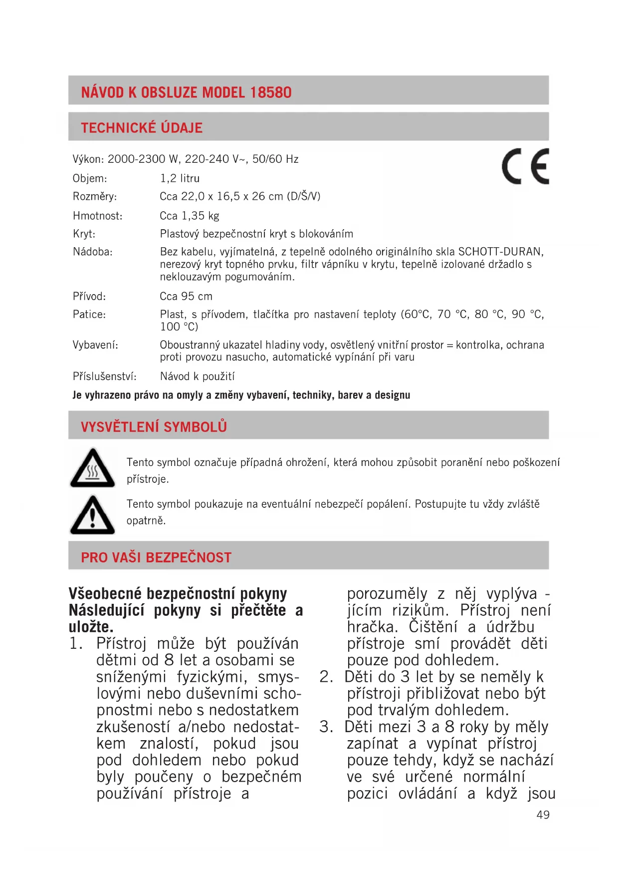 Tento symbol označuje případná ohrožení, která mohou způsobit poranění nebo poškození přístroje. Tento symbol poukazuje na eventuální nebezpečí popálení. Postupujte tu vždy zvláště opatrně. Výkon: 2000-2300 W, 220-240 V~, 50/60 Hz Objem: 1,2 litru Rozměry: Cca 22,0 x 16,5 x 26 cm (D/Š/V) Hmotnost: Cca 1,35 kg Kryt: Plastový bezpečnostní kryt s blokováním Nádoba: Bez kabelu, vyjímatelná, z tepelně odolného originálního skla SCHOTT-DURAN, nerezový kryt topného prvku, filtr vápníku v krytu, tepelně izolované držadlo s neklouzavým pogumováním. Přívod: Cca 95 cm Patice: Plast, s přívodem, tlačítka pro nastavení teploty (60°C, 70 °C, 80 °C, 90 °C, 100 °C) Vybavení: Oboustranný ukazatel hladiny vody, osvětlený vnitřní prostor = kontrolka, ochrana proti provozu nasucho, automatické vypínání při varu Příslušenství: Návod k použití Je vyhrazeno právo na omyly a změny vybavení, techniky, barev a designu50 pod dohledem nebo pokud byly poučeny o bezpečném používání přístroje a porozuměly z něj vyplýva