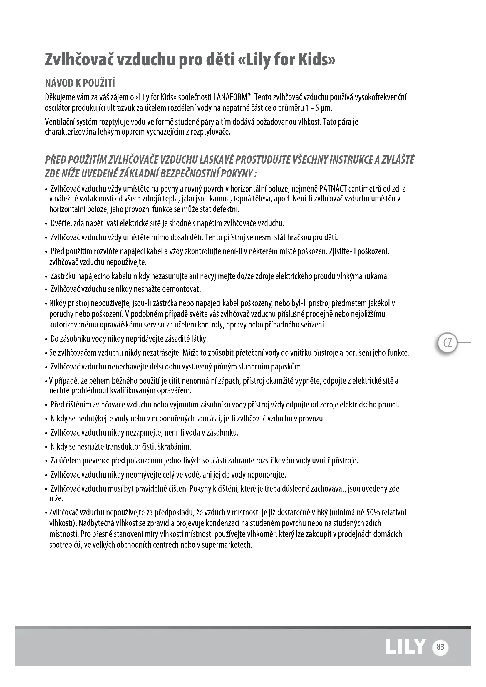 Děkujeme vám za váš zájem o «Lily for Kids» společnosti LANAFORM®. Tento zvlhčovač vzduchu používá vysokofrekvenční oscilátor produkující ultrazvuk za účelem rozdělení vody na nepatrné částice o průměru 1 - 5 μm. Ventilační systém rozptyluje vodu ve formě studené páry a tím dodává požadovanou vlhkost. Tato pára je charakterizována lehkým oparem vycházejícím z rozptylovače. PŘED POUŽITÍM ZVLHČOVAČE VZDUCHU LASKAVĚ PROSTUDUJTE VŠECHNY INSTRUKCE A ZVLÁŠTĚ ZDE NÍŽE UVEDENÉ ZÁKLADNÍ BEZPEČNOSTNÍ POKYNY :