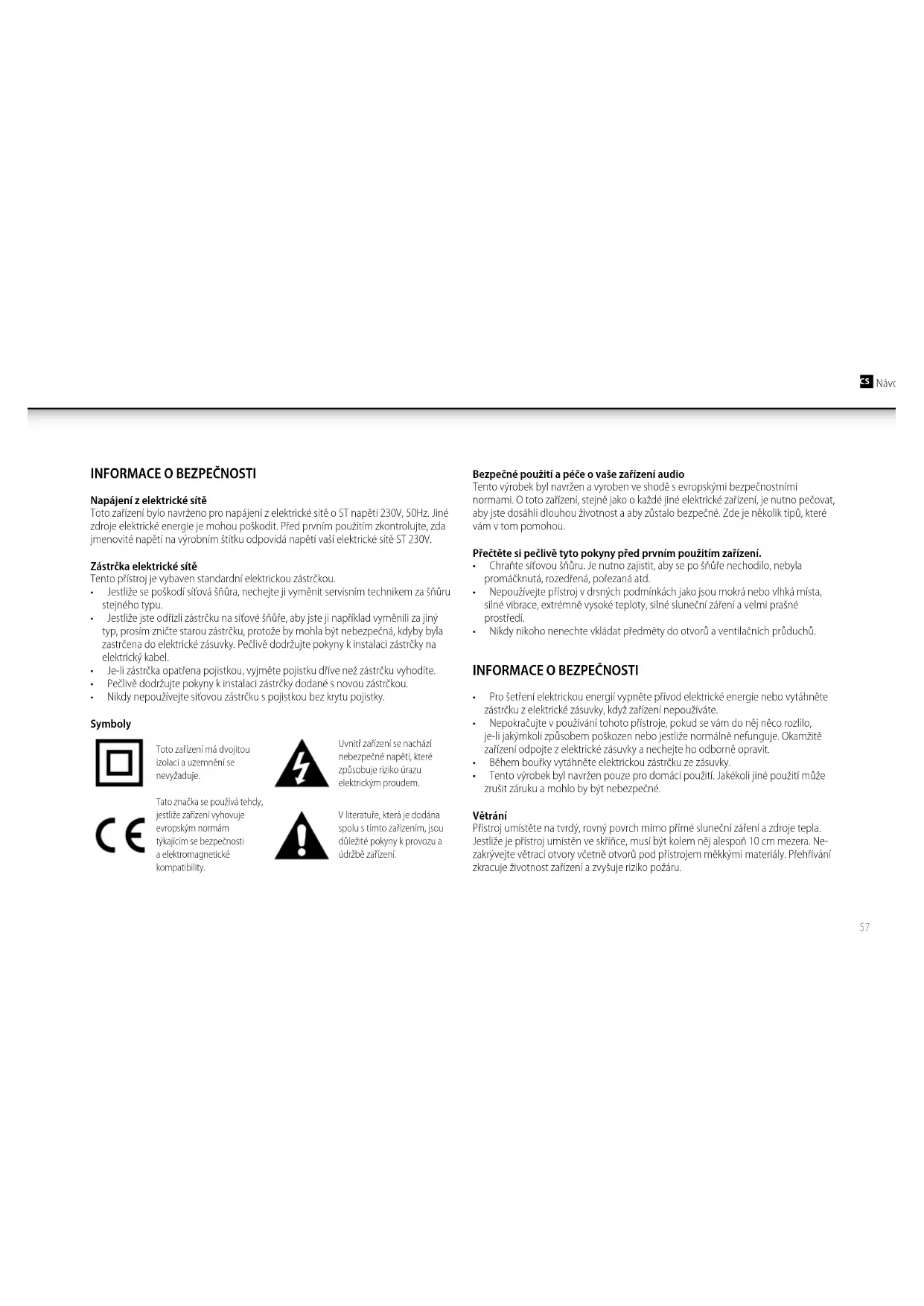 - Nikdy nepoužívejte síťovou zástrčku s pojistkou bez krytu pojistky. Symboly Toto zařízení má dvojitou izolaci a uzemnění se nevyžaduje. Uvnitř zařízení se nachází nebezpečné napětí, které způsobuje riziko úrazu elektrickým proudem. Tato značka se používá tehdy, jestliže zařízení vyhovuje evropským normám týkajícím se bezpečnosti a elektromagnetické kompatibility. V literatuře, která je dodána spolu s tímto zařízením, jsou důležité pokyny k provozu a údržbě zařízení. Bezpečné použití a péče o vaše zařízení audio Tento výrobek byl navržen a vyroben ve shodě s evropskými bezpečnostními normami. O toto zařízení, stejně jako o každé jiné elektrické zařízení, je nutno pečovat, aby jste dosáhli dlouhou životnost a aby zůstalo bezpečné. Zde je několik tipů, které vám v tom pomohou. Přečtěte si pečlivě tyto pokyny před prvním použitím zařízení.