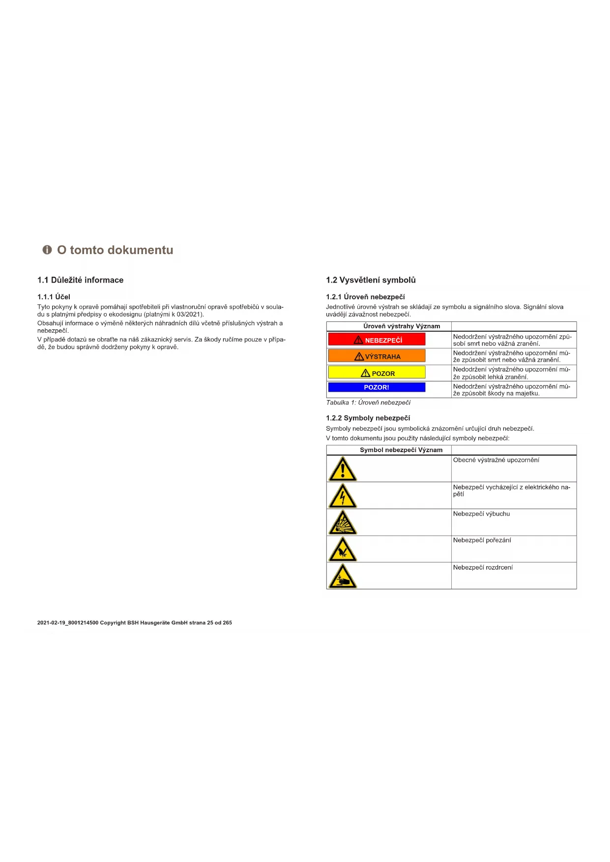 V tomto dokumentu jsou použity následující obecné symboly: Obecný symbol Význam Uvedení zvláštního tipu (text nebo grafické vyjádření) Uvedení jednoduchého tipu (pouze text) Uvedení odkazu k videonávodu Obecný symbol Význam Uvedení požadovaných nástrojů Uvedení požadovaných podmínek Uvedení podmínky (když, pak atd.) Uvedení výsledku Start Uvedení klávesy nebo tlačítka [00123456] Uvedení čísla materiálu Status Uvedení zobrazeného textu / okna (na ukazateli spotřebiče) Tabulka3: Obecné symboly O tomto dokumentu 2021-02-19_8001214500 Copyright BSH Hausgeräte GmbH strana26od265Bezpečnost