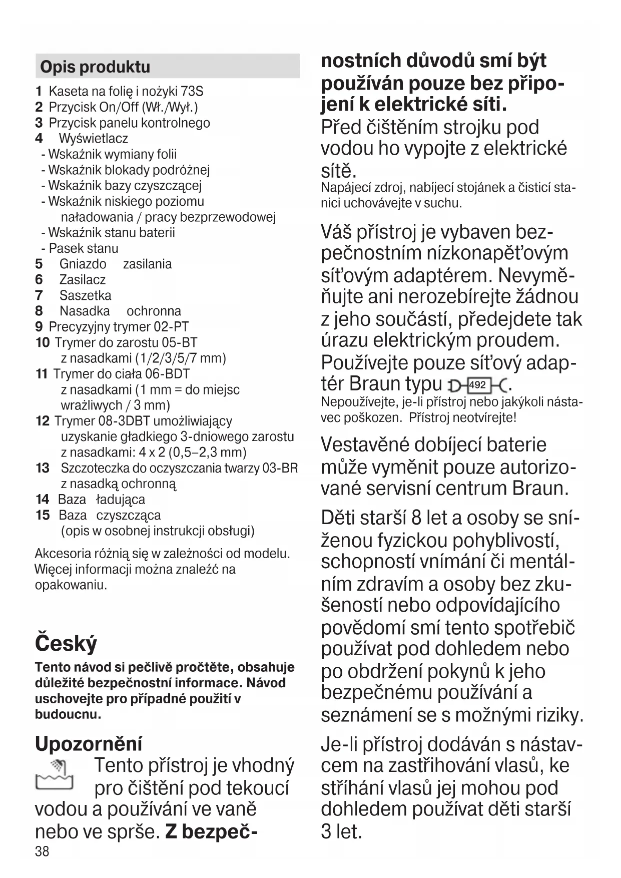 Szczoteczka do oczyszczania twarzy 03-BR z nasadką ochronną 14 Baza ładująca 15 Baza czyszcząca (opis w osobnej instrukcji obsługi) Akcesoria różnią się w zależności od modelu. Więcej informacji można znaleźć na opakowaniu. Český Tento návod si pečlivě pročtěte, obsahuje důležité bezpečnostní informace. Návod uschovejte pro případné použití v budoucnu. Upozornění Tento přístroj je vhodný pro čištění pod tekoucí vodou a používání ve vaně nebo ve sprše. Z bezpeč- nostních důvodů smí být používán pouze bez připo- jení k elektrické síti. Před čištěním strojku pod vodou ho vypojte z elektrické sítě. Napájecí zdroj, nabíjecí stojánek a čisticí sta- nici uchovávejte v suchu. Váš přístroj je vybaven bez- pečnostním nízkonapěťovým síťovým adaptérem. Nevymě- ňujte ani nerozebírejte žádnou z jeho součástí, předejdete tak úrazu elektrickým proudem. Používejte pouze síťový adap- tér Braun typu