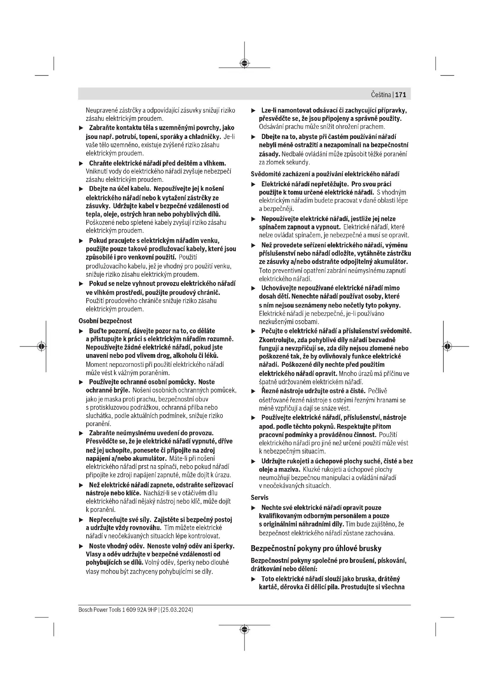 Aby wyłączyć elektronarzędzie, należy zwolnić włącznik/ wyłącznik(2). u Narzędzia szlifierskie należy kontrolować przed każ- dym użyciem. Narzędzie szlifierskie musi być prawi- dłowo zamocowane i musi się swobodnie obracać. Na- leży przeprowadzić próbę działania trwającą co naj- mniej jedną minutę (bez obciążenia). Nie wolno uży- wać uszkodzonych, odkształconych bądź wibrujących narzędzi szlifierskich. Uszkodzone narzędzia szlifierskie mogą się złamać i spowodować poważne obrażenia. Bosch Power Tools 1 609 92A 9HP | (25.03.2024)170 | Čeština Konserwacja i serwis Konserwacja i czyszczenie u Przed przystąpieniem do jakichkolwiek prac przy elektronarzędziu należy wyjąć wtyczkę z gniazda. u Utrzymywanie urządzenia i szczelin wentylacyjnych w czystości gwarantuje prawidłową i bezpieczną pracę. u W ekstremalnych warunkach pracy należy w miarę możliwości zawsze korzystać z systemu odsysania py- łu. Należy też często przedmuchiwać otwory wentyla- cyjne i stosować wyłącznik ochronny różnicowoprądo- wy. Podczas obróbki metali może dojść do osadzenia się wewnątrz elektronarzędzia pyłu metalicznego, mogącego przewodzić prąd. Może to mieć niekorzystny wpływ na izolację ochronną elektronarzędzia. Należy obchodzić się pieczołowicie z osprzętem podczas przechowywania i podczas pracy. Jeżeli konieczna okaże się wymiana przewodu przyłączenio- wego, należy zlecić ją firmie Bosch lub autoryzowanemu ser- wisowi elektronarzędzi Bosch, co pozwoli uniknąć ryzyka za- grożenia bezpieczeństwa. Pojemnik na pył Zalecamy opróżniać pojemnik na pył(3) codziennie lub w re- gularnych odstępach czasu po pracy, aby zapewnić optymal- ną ochronę przed pyłem. Częstotliwość czyszczenia jest zależna od stosowania elek- tronarzędzia. Obsługa klienta oraz doradztwo dotyczące użytkowania Ze wszystkimi pytaniami, dotyczącymi naprawy ikonserwa- cji nabytego produktu oraz dostępu do części zamiennych, prosimy zwracać się do punktów obsługi klienta. Rysunki techniczne oraz informacje o częściach zamiennych można znaleźć pod adresem: www.bosch-pt.com Nasz zespół doradztwa dotyczącego użytkowania odpowie na wszystkie pytania związane z produktami firmy Bosch oraz ich osprzętem. Przy wszystkich zgłoszeniach oraz zamówieniach części za- miennych konieczne jest podanie 10‑cyfrowego numeru ka- talogowego, znajdującego się na tabliczce znamionowej pro- duktu. Polska Robert Bosch Sp. z o.o. Serwis Elektronarzędzi Ul. Jutrzenki 102/104 02-230 Warszawa Na www.serwisbosch.com znajdą Państwo wszystkie szcze- góły dotyczące usług serwisowych online. Tel.: 22 7154450 Faks: 22 7154440 E-Mail: bsc@pl.bosch.com www.bosch-pt.pl Pozostałe adresy serwisów znajdują się na stronie: www.bosch-pt.com/serviceaddresses Utylizacja odpadów Elektronarzędzia, osprzęt i opakowanie należy doprowadzić do powtórnego przetworzenia zgodnie z obowiązującymi przepisami ochrony środowiska. Nie wolno wyrzucać elektronarzędzi razem z odpadami z gospodarstwa domowego! Tylko dla krajów UE: Niezdatne do użytku elektronarzędzia należy utylizować osobno. Należy korzystać z przewidzianych systemów zbiór- ki. W przypadku nieprawidłowej utylizacji zużyty sprzęt elek- tryczny i elektroniczny może mieć szkodliwe skutki dla śro- dowiska i zdrowia ludzkiego, wynikające z potencjalnej obec- ności substancji niebezpiecznych. Čeština Bezpečnostní upozornění Obecné bezpečnostní pokyny pro elektrické nářadí VÝSTRAHA Prostudujte si všechny bezpečnostní výstrahy, pokyny, ilustrace aspecifikace ktomuto elektrickému nářadí. Nedodržování všech níže uvedených pokynů může mít za následek úraz elektrickým proudem, požár a/nebo těžké poranění. Všechna varovná upozornění apokyny do budoucna uschovejte. Vupozorněních použitý pojem „elektrické nářadí“ se vztahuje na elektrické nářadí napájené ze sítě (se síťovým kabelem) ana elektrické nářadí napájené akumulátorem (bez síťového kabelu). Bezpečnost pracoviště u Udržujte pracoviště včistotě adobře osvětlené. Nepořádek nebo neosvětlené pracoviště mohou vést kúrazům. u Selektrickým nářadím nepracujte vprostředí ohroženém explozí, kde se nacházejí hořlavé kapaliny, plyny nebo prach. Elektrické nářadí vytváří jiskry, které mohou prach nebo páry zapálit. u Děti ajiné osoby udržujte při použití elektrického nářadí vbezpečné vzdálenosti od pracoviště. Při rozptýlení můžete ztratit kontrolu nad nářadím. Elektrická bezpečnost u Zástrčky elektrického nářadí musí lícovat se zásuvkou. Zástrčka nesmí být žádným způsobem upravena. Selektrickým nářadím sochranným uzemněním nepoužívejte žádné adaptérové zástrčky. 1 609 92A 9HP | (25.03.2024) Bosch Power ToolsČeština | 171 Neupravené zástrčky aodpovídající zásuvky snižují riziko zásahu elektrickým proudem. u Zabraňte kontaktu těla suzemněnými povrchy, jako jsou např. potrubí, topení, sporáky achladničky. Je‑li vaše tělo uzemněno, existuje zvýšené riziko zásahu elektrickým proudem. u Chraňte elektrické nářadí před deštěm avlhkem. Vniknutí vody do elektrického nářadí zvyšuje nebezpečí zásahu elektrickým proudem. u Dbejte na účel kabelu. Nepoužívejte jej knošení elektrického nářadí nebo kvytažení zástrčky ze zásuvky. Udržujte kabel vbezpečné vzdálenosti od tepla, oleje, ostrých hran nebo pohyblivých dílů. Poškozené nebo spletené kabely zvyšují riziko zásahu elektrickým proudem. u Pokud pracujete selektrickým nářadím venku, použijte pouze takové prodlužovací kabely, které jsou způsobilé ipro venkovní použití. Použití prodlužovacího kabelu, jež je vhodný pro použití venku, snižuje riziko zásahu elektrickým proudem. u Pokud se nelze vyhnout provozu elektri
