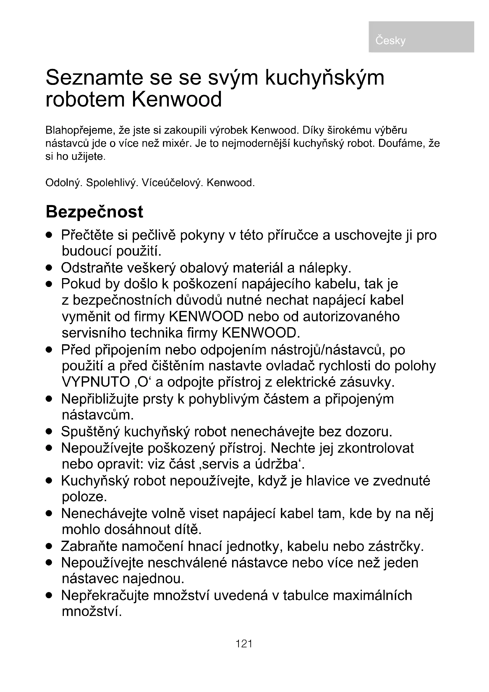 (OEEZ) Po ukončení doby provozní životnosti se tento výrobek nesmí likvidovat společně s domácím odpadem. Výrobek se musí odevzdat na specializovaném místě pro sběr tříděného odpadu, zřizovaném městskou správou anebo prodejcem, kde se tato služba poskytuje. Pomocí odděleného způsobu likvidace elektrospotřebičů se předchází vzniku negativních dopadů na životní prostředí a na zdraví, ke kterým by mohlo dojít v důsledku nevhodného nakládání s odpadem, a umožňuje se recyklace jednotlivých materiálů při dosažení významné úspory energií a surovin. Pro zdůraznění povinnosti tříděného sběru odpadu elektrospotřebičů je výrobek označený symbolem přeškrtnutého odpadkového koše.131 A Kenwood konyhagép használata Gratulálunk a Kenwood konyhagép megvásárlásához! A tartozékok széles választékának köszönhetően a készülék jóval több, mint egy egyszerű mixer: igazi korszerű univerzális konyhagép. Reméljük, élvezni fogja a használatát! Robusztus. Megbízható. Sokoldalú. Kenwood. Első a biztonság