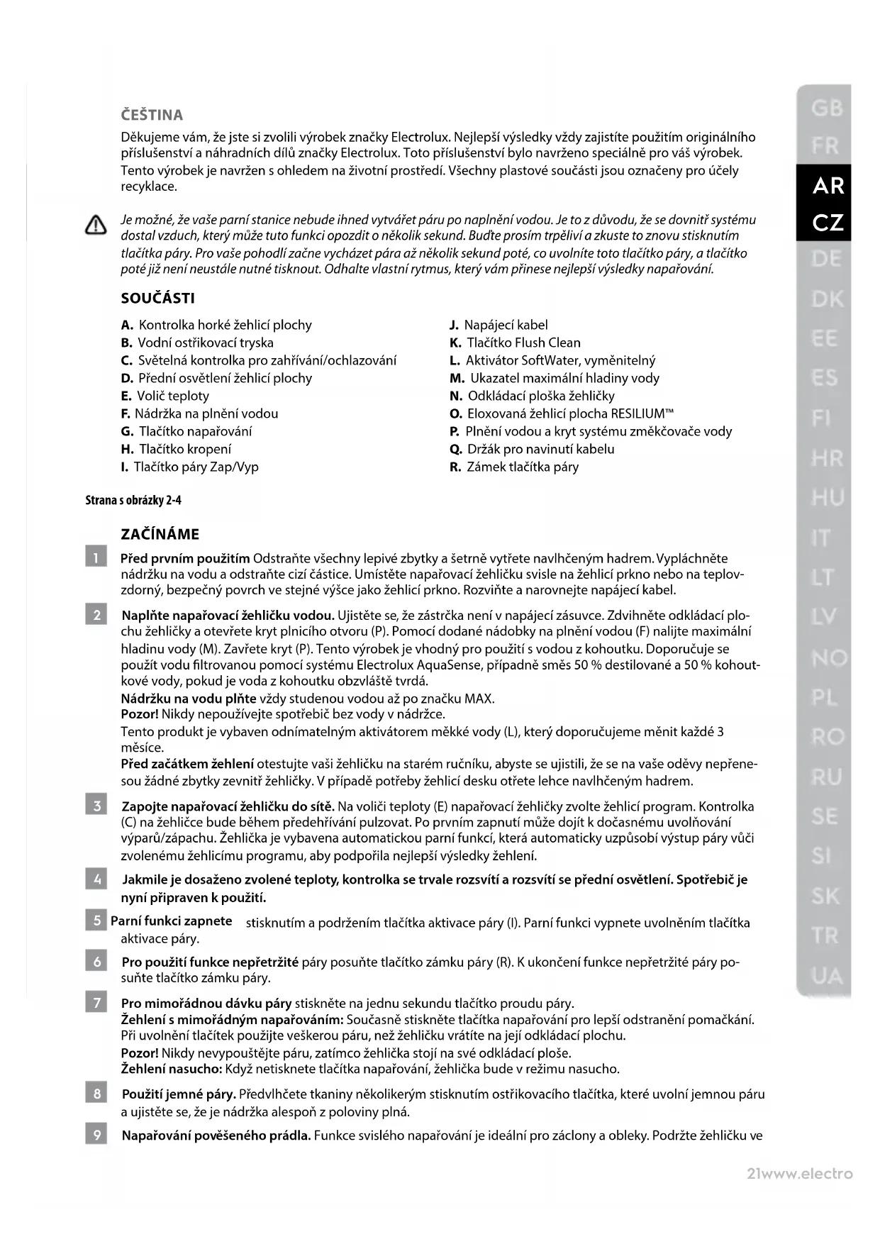 ČEŠTINA Děkujeme vám, že jste si zvolili výrobek značky Electrolux. Nejlepší výsledky vždy zajistíte použitím originálního příslušenství a náhradních dílů značky Electrolux. Toto příslušenství bylo navrženo speciálně pro váš výrobek. Tento výrobek je navržen s ohledem na životní prostředí. Všechny plastové součásti jsou označeny pro účely recyklace. Je možné, že vaše parní stanice nebude ihned vytvářet páru po naplnění vodou. Je to z důvodu, že se dovnitř systému dostal vzduch, který může tuto funkci opozdit o několik sekund. Buďte prosím trpěliví a zkuste to znovu stisknutím tlačítka páry. Pro vaše pohodlí začne vycházet pára až několik sekund poté, co uvolníte toto tlačítko páry, a tlačítko poté již není neustále nutné tisknout. Odhalte vlastní rytmus, který vám přinese nejlepší výsledky napařování. SOUČÁSTI A. Kontrolka horké žehlicí plochy B. Vodní ostřikovací tryska C. Světelná kontrolka pro zahřívání/ochlazování D. Přední osvětlení žehlicí plochy E. Volič teploty F. Nádržka na plnění vodou G. Tlačítko napařování H. Tlačítko kropení
