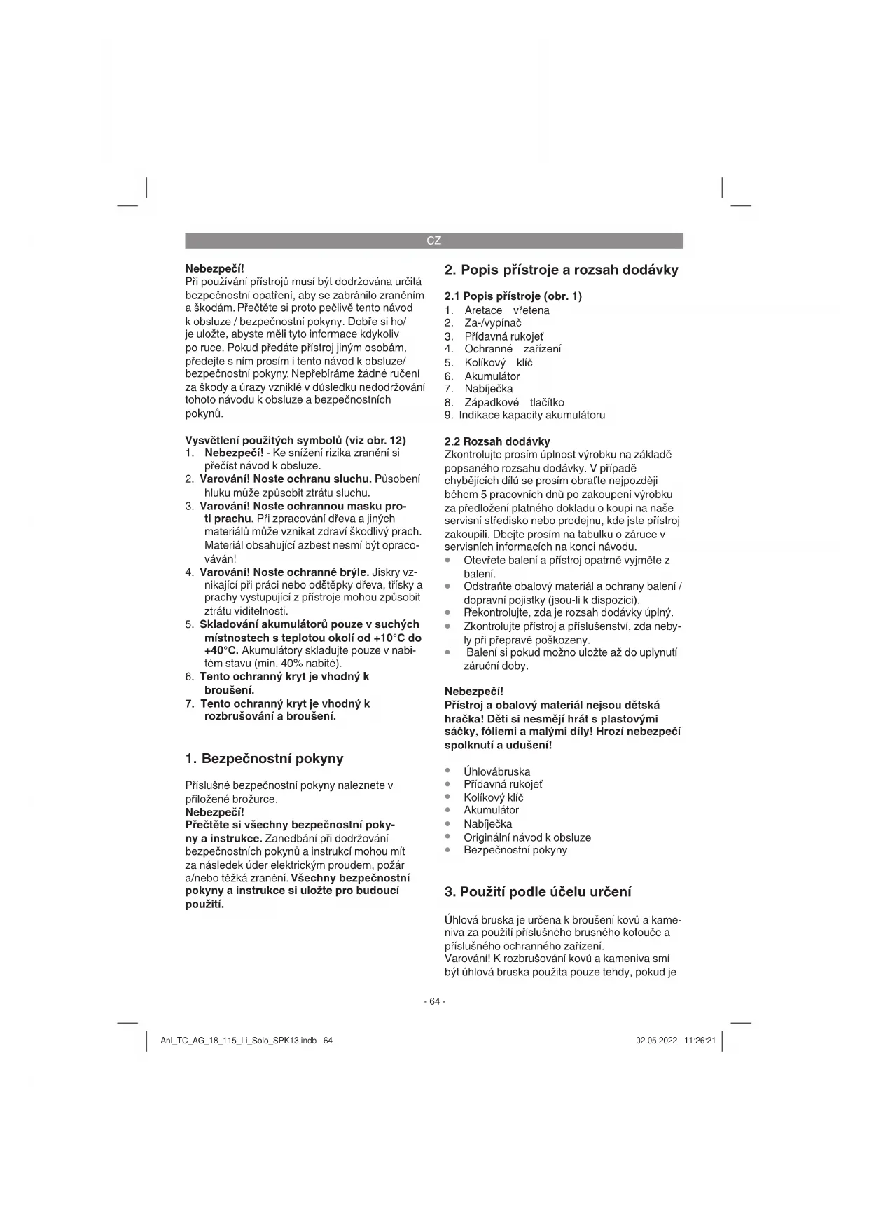 Úhlová bruska je určena k broušení kovů a kame- niva za použití příslušného brusného kotouče a příslušného ochranného zařízení. Varování! K rozbrušování kovů a kameniva smí být úhlová bruska použita pouze tehdy, pokud je Anl_TC_AG_18_115_Li_Solo_SPK13.indb 64Anl_TC_AG_18_115_Li_Solo_SPK13.indb 64 02.05.2022 11:26:2102.05.2022 11:26:21CZ