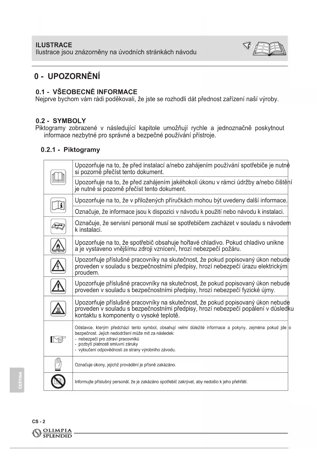 su společnosti OLIMPIA SPLENDID je zakázáno jeho kopírování nebo poskytování třetím osobám. Spotřebiče mohou být přepracovány, a proto mohou obsahovat díly odlišné od zobraze- ných komponentů, aniž by byly dotčeny texty obsažené v této příručce.