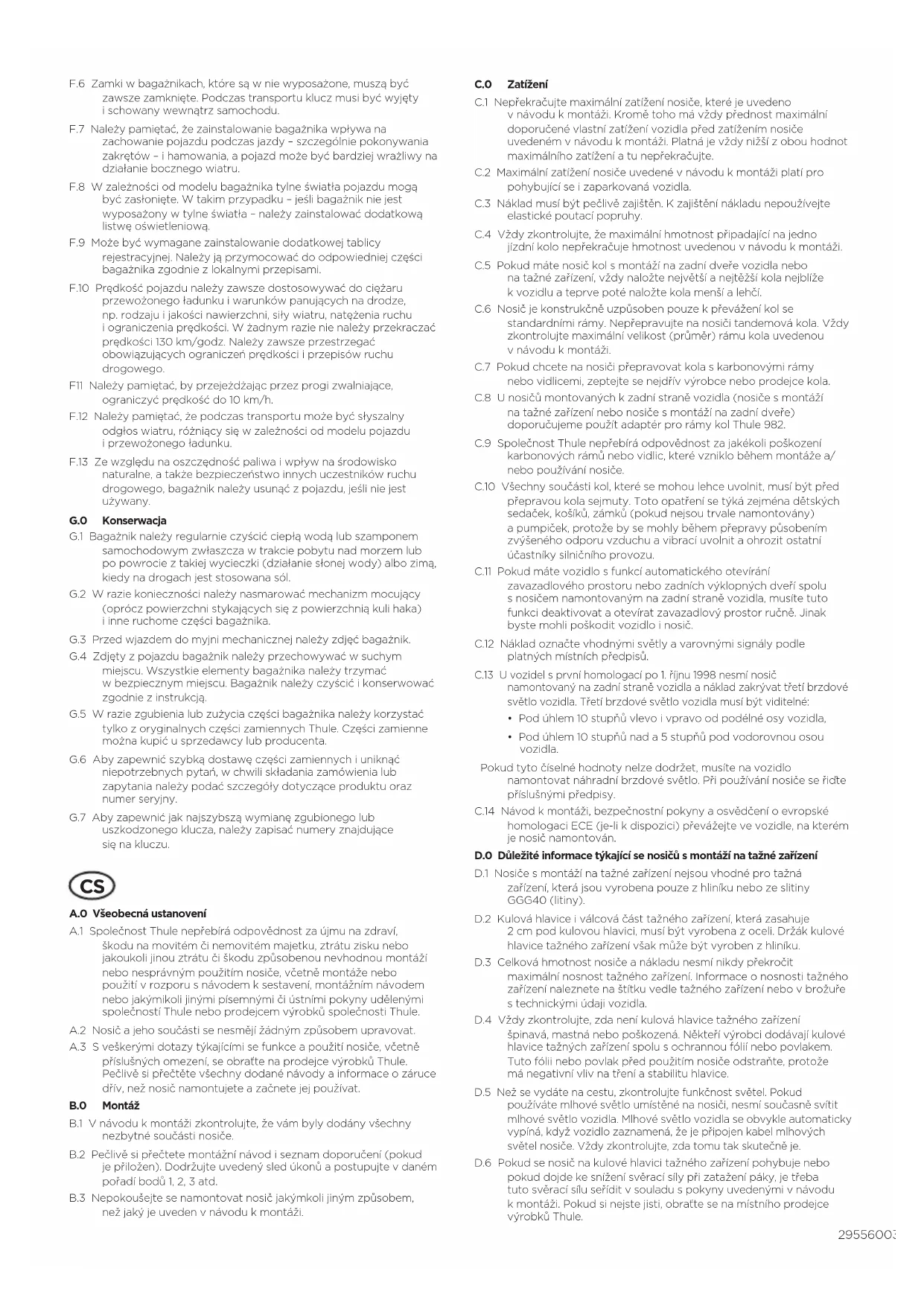 A.0 Všeobecná ustanovení A.1 Společnost Thule nepřebírá odpovědnost za újmu na zdraví, škodu na movitém či nemovitém majetku, ztrátu zisku nebo jakoukoli jinou ztrátu či škodu způsobenou nevhodnou montáží nebo nesprávným použitím nosiče, včetně montáže nebo použití vrozporu snávodem ksestavení, montážním návodem nebo jakýmikoli jinými písemnými či ústními pokyny udělenými společností Thule nebo prodejcem výrobků společnosti Thule. A.2 Nosič ajeho součásti se nesmějí žádným způsobem upravovat. A.3 Sveškerými dotazy týkajícími se funkce apoužití nosiče, včetně příslušných omezení, se obraťte na prodejce výrobků Thule. Pečlivě si přečtěte všechny dodané návody ainformace ozáruce dřív, než nosič namontujete azačnete jej používat. B.0 Montáž B.1 Vnávodu kmontáži zkontrolujte, že vám byly dodány všechny nezbytné součásti nosiče. B.2 Pečlivě si přečtete montážní návod iseznam doporučení (pokud je přiložen). Dodržujte uvedený sled úkonů apostupujte vdaném pořadí bodů 1, 2, 3 atd. B.3 Nepokoušejte se namontovat nosič jakýmkoli jiným způsobem, než jaký je uveden vnávodu kmontáži. C.0 Zatížení C.1 Nepřekračujte maximální zatížení nosiče, které je uvedeno vnávodu kmontáži. Kromě toho má vždy přednost maximální doporučené vlastní zatížení vozidla před zatížením nosiče uvedeném vnávodu kmontáži. Platná je vždy nižší zobou hodnot maximálního zatížení atu nepřekračujte. C.2 Maximální zatížení nosiče uvedené vnávodu kmontáži platí pro pohybující se izaparkovaná vozidla. C.3 Náklad musí být pečlivě zajištěn. Kzajištění nákladu nepoužívejte elastické poutací popruhy. C.4 Vždy zkontrolujte, že maximální hmotnost připadající na jedno jízdní kolo nepřekračuje hmotnost uvedenou vnávodu kmontáži. C.5 Pokud máte nosič kol smontáží na zadní dveře vozidla nebo na tažné zařízení, vždy naložte největší anejtěžší kola nejblíže kvozidlu ateprve poté naložte kola menší alehčí. C.6 Nosič je konstrukčně uzpůsoben pouze kpřevážení kol se standardními rámy. Nepřepravujte na nosiči tandemová kola. Vždy zkontrolujte maximální velikost (průměr) rámu kola uvedenou vnávodu kmontáži. C.7 Pokud chcete na nosiči přepravovat kola skarbonovými rámy nebo vidlicemi, zeptejte se nejdřív výrobce nebo prodejce kola. C.8 Unosičů montovaných kzadní straně vozidla (nosiče smontáží na tažné zařízení nebo nosiče smontáží na zadní dveře) doporučujeme použít adaptér pro rámy kol Thule 982. C.9 Společnost Thule nepřebírá odpovědnost za jakékoli poškození karbonových rámů nebo vidlic, které vzniklo během montáže a/ nebo používání nosiče. C.10 Všechny součásti kol, které se mohou lehce uvolnit, musí být před přepravou kola sejmuty. Toto opatření se týká zejména dětských sedaček, košíků, zámků (pokud nejsou trvale namontovány) apumpiček, protože by se mohly během přepravy působením zvýšeného odporu vzduchu avibrací uvolnit aohrozit ostatní účastníky silničního provozu. C.11 Pokud máte vozidlo sfunkcí automatického otevírání zavazadlového prostoru nebo zadních výklopných dveří spolu snosičem namontovaným na zadní straně vozidla, musíte tuto funkci deaktivovat aotevírat zavazadlový prostor ručně. Jinak byste mohli poškodit vozidlo inosič. C.12 Náklad označte vhodnými světly avarovnými signály podle platných místních předpisů. C.13 Uvozidel sprvní homologací po 1.říjnu1998 nesmí nosič namontovaný na zadní straně vozidla anáklad zakrývat třetí brzdové světlo vozidla. Třetí brzdové světlo vozidla musí být viditelné: