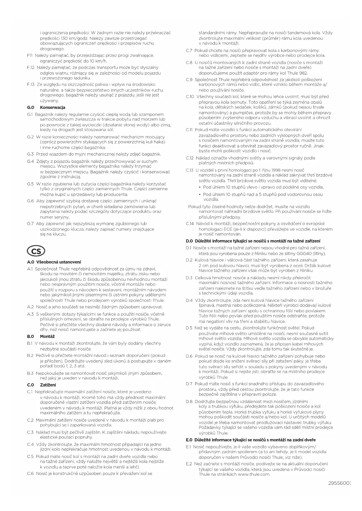 A.0 Všeobecná ustanovení A.1 Společnost Thule nepřebírá odpovědnost za újmu na zdraví, škodu na movitém či nemovitém majetku, ztrátu zisku nebo jakoukoli jinou ztrátu či škodu způsobenou nevhodnou montáží nebo nesprávným použitím nosiče, včetně montáže nebo použití vrozporu snávodem ksestavení, montážním návodem nebo jakýmikoli jinými písemnými či ústními pokyny udělenými společností Thule nebo prodejcem výrobků společnosti Thule. A.2 Nosič ajeho součásti se nesmějí žádným způsobem upravovat. A.3 Sveškerými dotazy týkajícími se funkce apoužití nosiče, včetně příslušných omezení, se obraťte na prodejce výrobků Thule. Pečlivě si přečtěte všechny dodané návody ainformace ozáruce dřív, než nosič namontujete azačnete jej používat. B.0 Montáž B.1 Vnávodu kmontáži zkontrolujte, že vám byly dodány všechny nezbytné součásti nosiče. B.2 Pečlivě si přečtete montážní návod iseznam doporučení (pokud je přiložen). Dodržujte uvedený sled úkonů apostupujte vdaném pořadí bodů 1, 2, 3 atd. B.3 Nepokoušejte se namontovat nosič jakýmkoli jiným způsobem, než jaký je uveden vnávodu kmontáži. C.0 Zatížení C.1 Nepřekračujte maximální zatížení nosiče, které je uvedeno vnávodu kmontáži. Kromě toho má vždy přednost maximální doporučené vlastní zatížení vozidla před zatížením nosiče uvedeném vnávodu kmontáži. Platná je vždy nižší zobou hodnot maximálního zatížení atu nepřekračujte. C.2 Maximální zatížení nosiče uvedené vnávodu kmontáži platí pro pohybující se izaparkovaná vozidla. C.3 Náklad musí být pečlivě zajištěn. Kzajištění nákladu nepoužívejte elastické poutací popruhy. C.4 Vždy zkontrolujte, že maximální hmotnost připadající na jedno jízdní kolo nepřekračuje hmotnost uvedenou vnávodu kmontáži. C.5 Pokud máte nosič kol smontáží na zadní dveře vozidla nebo na tažné zařízení, vždy naložte největší anejtěžší kola nejblíže kvozidlu ateprve poté naložte kola menší alehčí. C.6 Nosič je konstrukčně uzpůsoben pouze kpřevážení kol se standardními rámy. Nepřepravujte na nosiči tandemová kola. Vždy zkontrolujte maximální velikost (průměr) rámu kola uvedenou vnávodu kmontáži. C.7 Pokud chcete na nosiči přepravovat kola skarbonovými rámy nebo vidlicemi, zeptejte se nejdřív výrobce nebo prodejce kola. C.8 Unosičů montovaných kzadní straně vozidla (nosiče smontáží na tažné zařízení nebo nosiče smontáží na zadní dveře) doporučujeme použít adaptér pro rámy kol Thule 982. C.9 Společnost Thule nepřebírá odpovědnost za jakékoli poškození karbonových rámů nebo vidlic, které vzniklo během montáže a/ nebo používání nosiče. C.10 Všechny součásti kol, které se mohou lehce uvolnit, musí být před přepravou kola sejmuty. Toto opatření se týká zejména obalů na kola, dětských sedaček, košíků, zámků (pokud nejsou trvale namontovány) apumpiček, protože by se mohly během přepravy působením zvýšeného odporu vzduchu avibrací uvolnit aohrozit ostatní účastníky silničního provozu. C.11 Pokud máte vozidlo sfunkcí automatického otevírání zavazadlového prostoru nebo zadních výklopných dveří spolu snosičem namontovaným na zadní straně vozidla, musíte tuto funkci deaktivovat aotevírat zavazadlový prostor ručně. Jinak byste mohli poškodit vozidlo inosič. C.12 Náklad označte vhodnými světly avarovnými signály podle platných místních předpisů. C.13 Uvozidel sprvní homologací po 1.říjnu1998 nesmí nosič namontovaný na zadní straně vozidla anáklad zakrývat třetí brzdové světlo vozidla. Třetí brzdové světlo vozidla musí být viditelné: