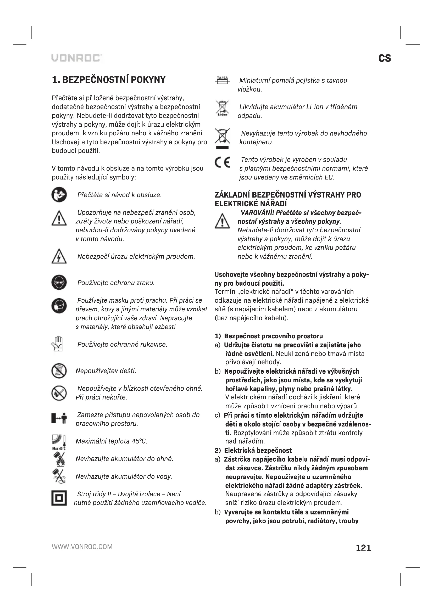 AKUMULÁTORY a) Akumulátor nerozebírejte. Nebezpečí zkratu. b) Chraňte akumulátor před teplem, např. před nepřetržitým intenzivním slunečním světlem, ohněm, vodou avlhkostí. Nebezpečí výbuchu. c) Vpřípadě poškození anesprávného použití aku- mulátoru se mohou uvolňovat výpary. Vpřípadě potíží vyvětrejte místnost avyhledejte lékařskou pomoc. Výpary mohou dráždit dýchací ústrojí. d) Používejte tento akumulátor výhradně svýrob- kem značky Vonroc. Toto opatření samo osobě chrání akumulátor před nebezpečným přetížením. e) Akumulátor může být poškozen ostrými před- měty, jako například hřebíky nebo šroubováky, nebo vnější silou. Může dojít kvnitřnímu zkratu avznícení, vzniku kouře, výbuchu nebo přehřátí akumulátoru. BEZPEČNOSTNÍ VAROVÁNÍ PRO NABÍJEČKU Určené použití Touto nabíječkou nabíjejte výhradně akumulátorové moduly typu CD801AA aCD803AA. Ostatní typy akumulátorů mohou prasknout azpů- sobit zranění apoškození. a) Tento výrobek není určen kpoužití osobami (včetně dětí) se sníženými fyzickými, smys- lovými nebo duševními schopnostmi, nebo snedostatkem zkušeností aznalostí, pokud jim nebyl stanoven dohled nebo pokud jim nebyly poskytnuty potřebné instrukce. b) Děti musí být pod dozorem, aby si stímto zaří- zením nehrály. c) Nenabíjejte baterie, které nejsou knabíjení určeny! d) Během nabíjení musí být akumulátory umístěny na dobře větraném místě! Elektrická bezpečnost Vždy zkontrolujte, zda se napájecí napětí sítě shoduje snapájecím napětím na výkonovém štítku.