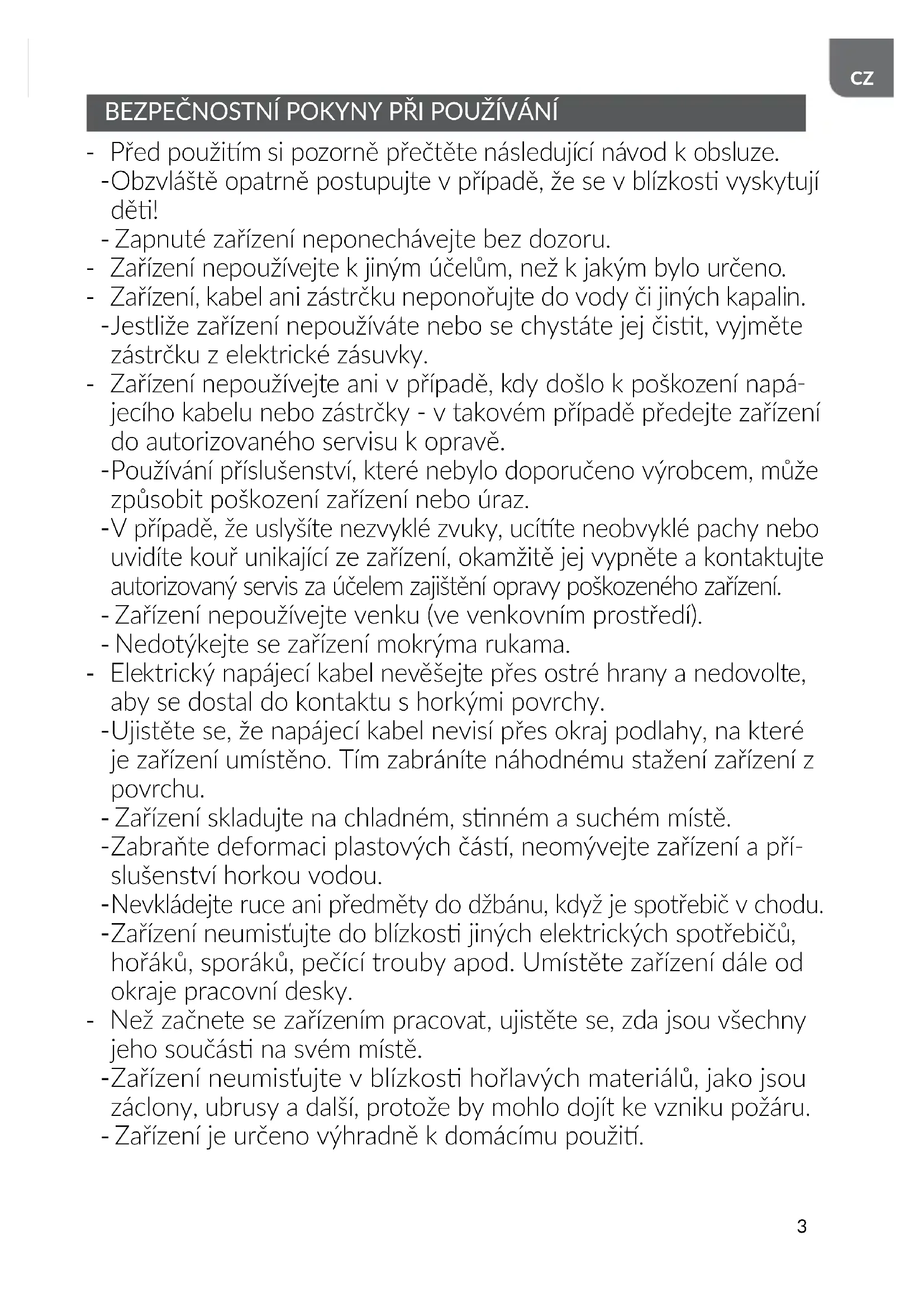 Zařízení neumisťujte v blízkos hořlavých materiálů, jako jsou záclony, ubrusy a další, protože by mohlo dojít ke vzniku požáru. - Zařízení je určeno výhradně k domácímu použi.4 C Z