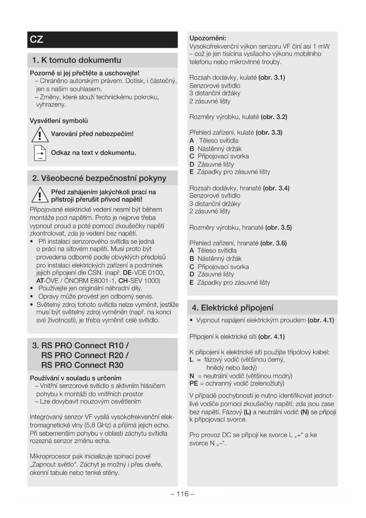 RS PRO Connect R20 / RS PRO Connect R30 Používání vsouladu surčením – Vnitřní senzorové svítidlo s aktivním hlásičem pohybu k montáži do vnitřních prostor – Lze dovybavit nouzovým osvětlením Integrovaný senzor VF vysílá vysokofrekvenční elek- tromagnetické vlny (5,8 GHz) apřijímá jejich echo. Při sebemenším pohybu voblasti záchytu svítidla rozezná senzor změnu echa. Mikroprocesor pak inicializuje spínací povel „Zapnout světlo“. Záchyt je možný ipřes dveře, okenní tabule nebo tenké stěny. Upozornění: Vysokofrekvenční výkon senzoru VF činí asi 1 mW – což je jen tisícina vysílacího výkonu mobilního telefonu nebo mikrovlnné trouby. Rozsah dodávky, kulaté (obr.3.1) Senzorové svítidlo 3 distanční držáky 2 zásuvné lišty Rozměry výrobku, kulaté (obr.3.2) Přehled zařízení, kulaté (obr.3.3) A Těleso svítidla B Nástěnný držák C Připojovací svorka D Zásuvné lišty E Západky pro zásuvné lišty Rozsah dodávky, hranaté (obr.3.4) Senzorové svítidlo 3 distanční držáky 2 zásuvné lišty Rozměry výrobku, hranaté (obr.3.5) Přehled zařízení, hranaté (obr.3.6) A Těleso svítidla B Nástěnný držák C Připojovací svorka D Zásuvné lišty E Západky pro zásuvné lišty