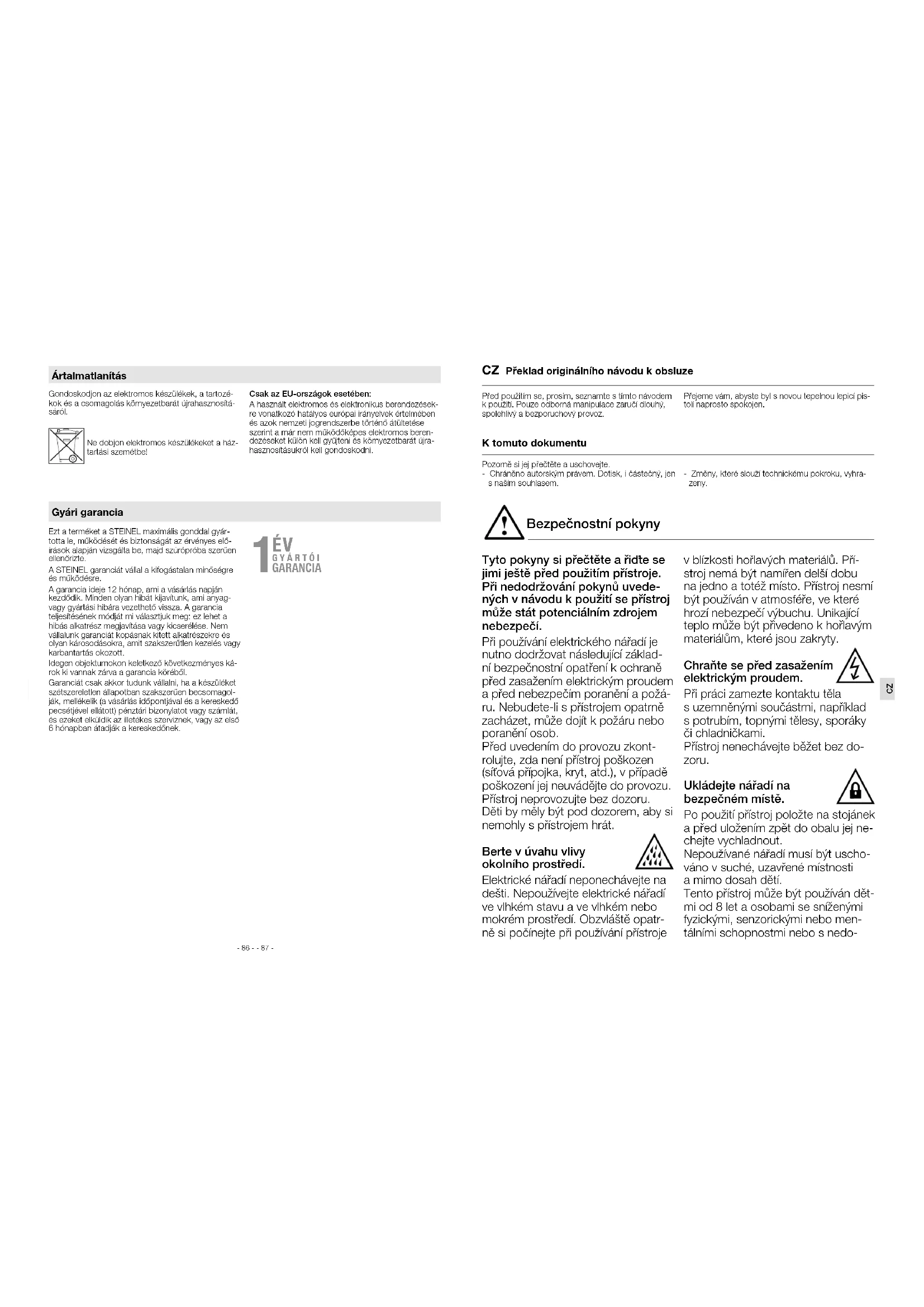 Záruka výrobce Likvidace Elektrická zařízení, příslušenství a obaly by měly být odvezeny k ekologickému opětovnému zhodnocení. Nevyhazujte elektrická zařízení do domovního odpadu!Jen pro země EU:V souladu splatnou evropskou směrnicí oodpad-ních elektrických a elektronických zařízeních a jejím převedení do národního práva musí být nepoužitelná elektrická zařízení separována a odevzdána kekolo-gickému opětovnému zhodnocení.Tento výrobek firmy STEINEL je vyráběn smaximální pozorností věnovanou jeho funkčnosti abezpečnosti, které byly vyzkoušeny podle platných předpisů, při-čemž se výrobek rovněž podrobil namátkové výstupní kontrole.Firma STEINEL přebírá záruku za bezvadné provedení afunkčnost.Záruka se poskytuje vdélce 12 měsíců azačíná dnem prodeje výrobku spotřebiteli. Odstraněny vám budou výrobní vady azávady zapříčiněné vadným materiálem, přičemž záruka spočívá vopravě nebo výměně chybného dílu dle našeho výběru. Záruka se nevztahuje na škody na dílech podléhajících opo-třebení, na škody avady zapříčiněné nesprávným zacházením nebo údržbou.Uplatňování dalších nároků následných škod na cizích věcech je vyloučeno.Záruka bude uznána jen tehdy, bude-li nedemontova-ný přístroj dobře zabalen, přiložena pokladní stvrzen-ka nebo faktura (datum prodeje arazítko prodejny), poslán na adresu příslušného servisu nebo během prvních 6měsíců předán prodejně.