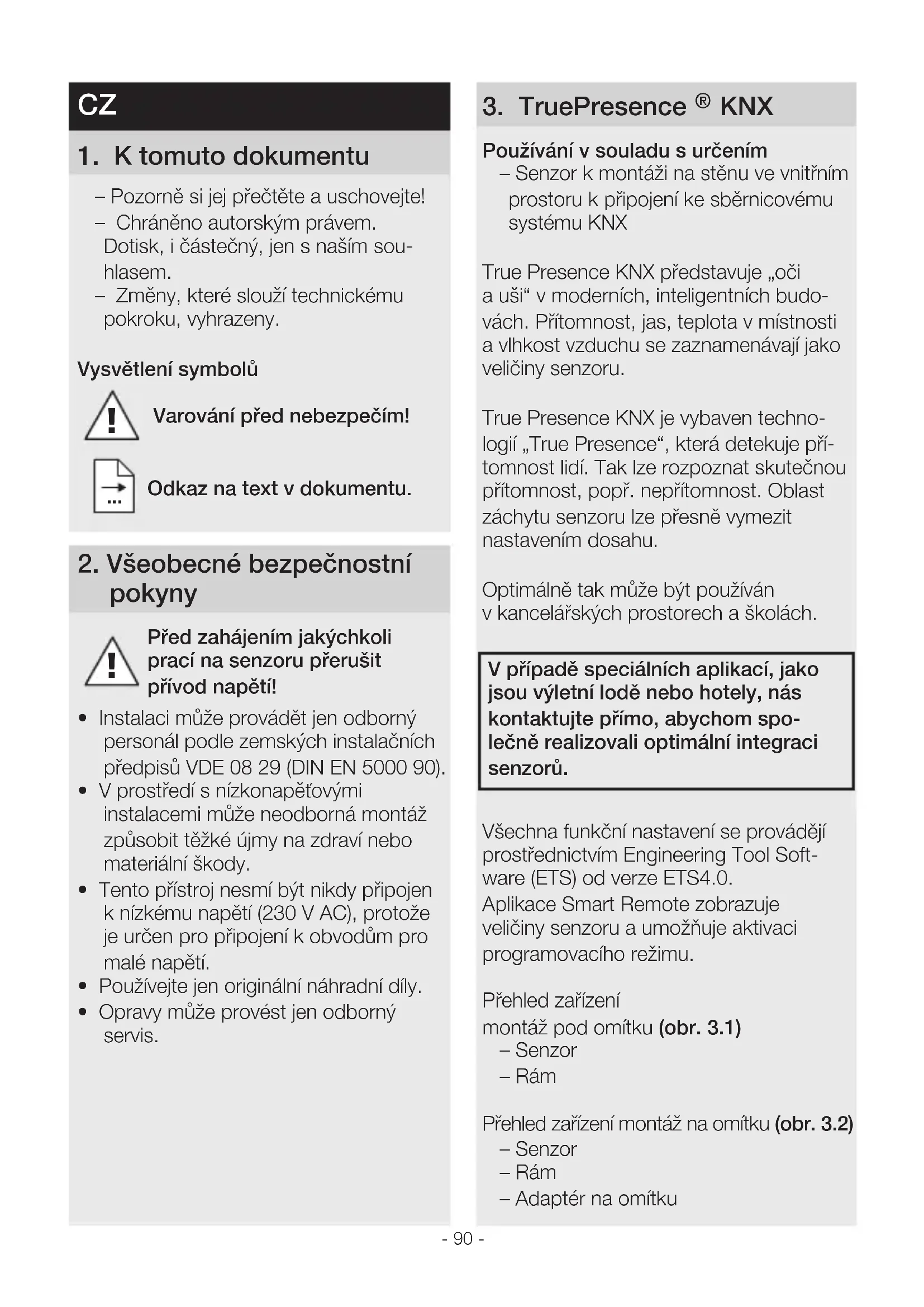 KNX Používání vsouladu surčením – Senzor k montáži na stěnu ve vnitřním prostoru k připojení ke sběrnicovému systému KNX True Presence KNX představuje „oči auši“ vmoderních, inteligentních budo- vách. Přítomnost, jas, teplota vmístnosti a vlhkost vzduchu se zaznamenávají jako veličiny senzoru. True Presence KNX je vybaven techno- logií „TruePresence“, která detekuje pří- tomnost lidí. Tak lze rozpoznat skutečnou přítomnost, popř. nepřítomnost. Oblast záchytu senzoru lze přesně vymezit nastavením dosahu. Optimálně tak může být používán v kancelářských prostorech a školách. V případě speciálních aplikací, jako jsou výletní lodě nebo hotely, nás kontaktujte přímo, abychom spo- lečně realizovali optimální integraci senzorů Všechna funkční nastavení se provádějí prostřednictvím Engineering Tool Soft- ware (ETS) od verze ETS4.0. Aplikace Smart Remote zobrazuje veličiny senzoru a umožňuje aktivaci programovacího režimu. Přehled zařízení montáž pod omítku (obr31) – Senzor – Rám Přehled zařízení montáž na omítku (obr32) – Senzor – Rám – Adaptér na omítku- 90 - - 91 - Upozornění: K nastavení dosahu je nutné zadat montážní výšku prostřednictvím ETS. Upozornění: Montáž na omítku má vliv na zjištěné veličiny senzoru. Proto jsou v softwaru implementovány korekční faktory, které díky aktivaci druhu montáže „na omítku“ působí v ETS. 6 Funkce a nastavení Nastavení zvýroby – Viz popis aplikace KNX Uvedení do provozu Při prvním uvedení do provozu vytvoří prezenční hlásič prostorový obraz. Přitom nesmí v prostoru docházet k pohybu po dobu 2 až 2,5minuty. Upozornění: Po změně dosahu nebo montážní výšky se také vytvoří prostorový obraz. Citlivost senzoru True Presence může být nastavena prostřednictvím ETS od 1(=nízká) do 9 (=vysoká). Které funkce mají být použity (aktivová- ny), se nastaví v okně parametrů „Všeobecná nastavení“ pomocí ETS. Upozornění: Popis aplikace najdete na adrese knxsteinelde