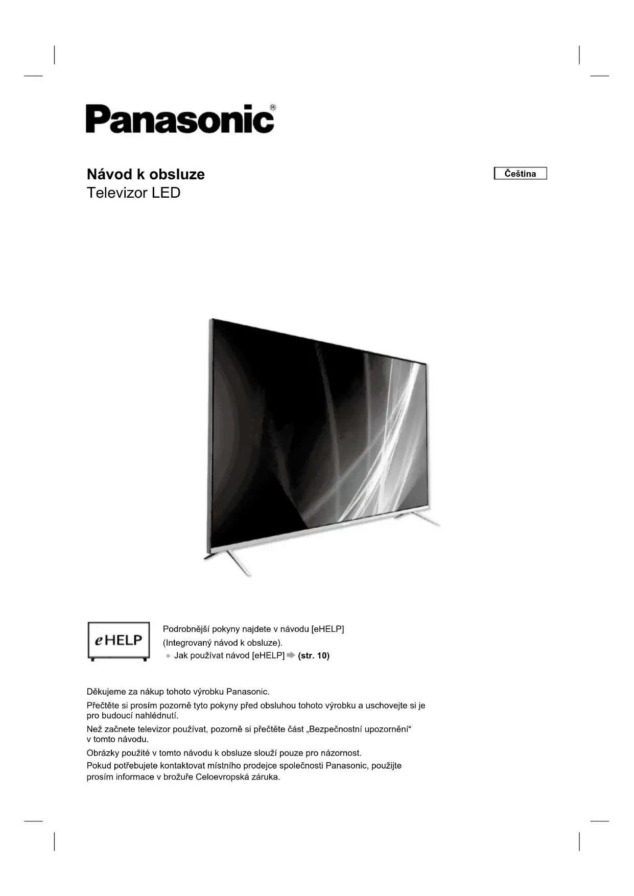 Informaceosoftwarusotevřenýmzdrojovým kódemviznabídka(Domů>Nastavení>Předvolby zařízení>Oaplikaci>Právníinformace) Podrobnějšíinformaceoproduktu najdetenastránceEPREL:https://eprel.ec.europa.eu. RegistračníčísloEPRELjedostupnénaadrese https://eprel.panasonic.eu/product.Záznamy zákazníka Číslo modelu a sériové číslo tohoto produktu naleznete na jeho zadním panelu. Toto sériové číslo byste si měli poznamenat níže a tuto příručku uchovat spolu s dokladem o nákupu (účtenkou). Budou sloužit jako trvalý záznam vašeho nákupu a pomohou vám při identifikaci přístroje v případě krádeže nebo ztráty. Poslouží také pro účely záručního servisu. Číslo modelu Sériové číslo Panasonic Marketing Europe GmbH Hagenauer Strasse 43, D-65203 Wiesbaden, Německo Webová stránka: http://www.panasonic.com Čeština Likvidace starých zařízení a baterií Platí pouze pro země Evropské unie a pro země, které využívají systémy recyklace Tyto symboly na výrobcích, obalech nebo v průvodní dokumentaci znamenají, že použitá elektrická a elektronická zařízení a baterie nepatří do běžného domácího odpadu. Správná likvidace, recyklace a opětovné použití jsou možné jen pokud odevzdáte tato zařízení a použité baterie na místech k tomu určených v souladu s platnými národnímu předpisy. Jejich správnou likvidací pomůžete šetřit cenné suroviny a předcházet možným negativním účinkům na lidské zdraví a na přírodní prostředí. Další informace o sběru, likvidaci a recyklaci starých přístrojů a použitých baterií vám poskytnou místní úřady. Při nesprávné likvidaci odpadu vám hrozí pokuta v souladu s národní legislativou a místními předpisy. Poznámka k symbolu baterie (symbol dole): Tento symbol může být použit v kombinaci s chemickým symbolem. V tomto případě splňuje tento symbol legislativní požadavky, které jsou předepsány pro chemickou látku obsaženou v baterii.Instrukcja obsługi Telewizor LED Polski Dziękujemy za zakup tego produktu firmy Panasonic. Przed rozpoczęciem korzystania z tego produktu należy dokładnie zapoznać się z niniejszą instrukcją i zachować ją na przyszłość. Przed rozpoczęciem korzystania z urządzenia należy dokładnie zapoznać się z częścią „Zalecenia dotyczące bezpieczeństwa” niniejszej instrukcji obsługi. Ilustracje przedstawione w niniejszej instrukcji obsługi mają wyłącznie charakter poglądowy. Jeśli chcesz skontaktować się z lokalnym sprzedawcą Panasonic w celu uzyskania pomocy, zapoznaj się z ogólnoeuropejską kartą gwarancyjną Bardziej szczegółowe instrukcje znajdziesz w [eHELP] (Wbudowana instrukcja obsługi).