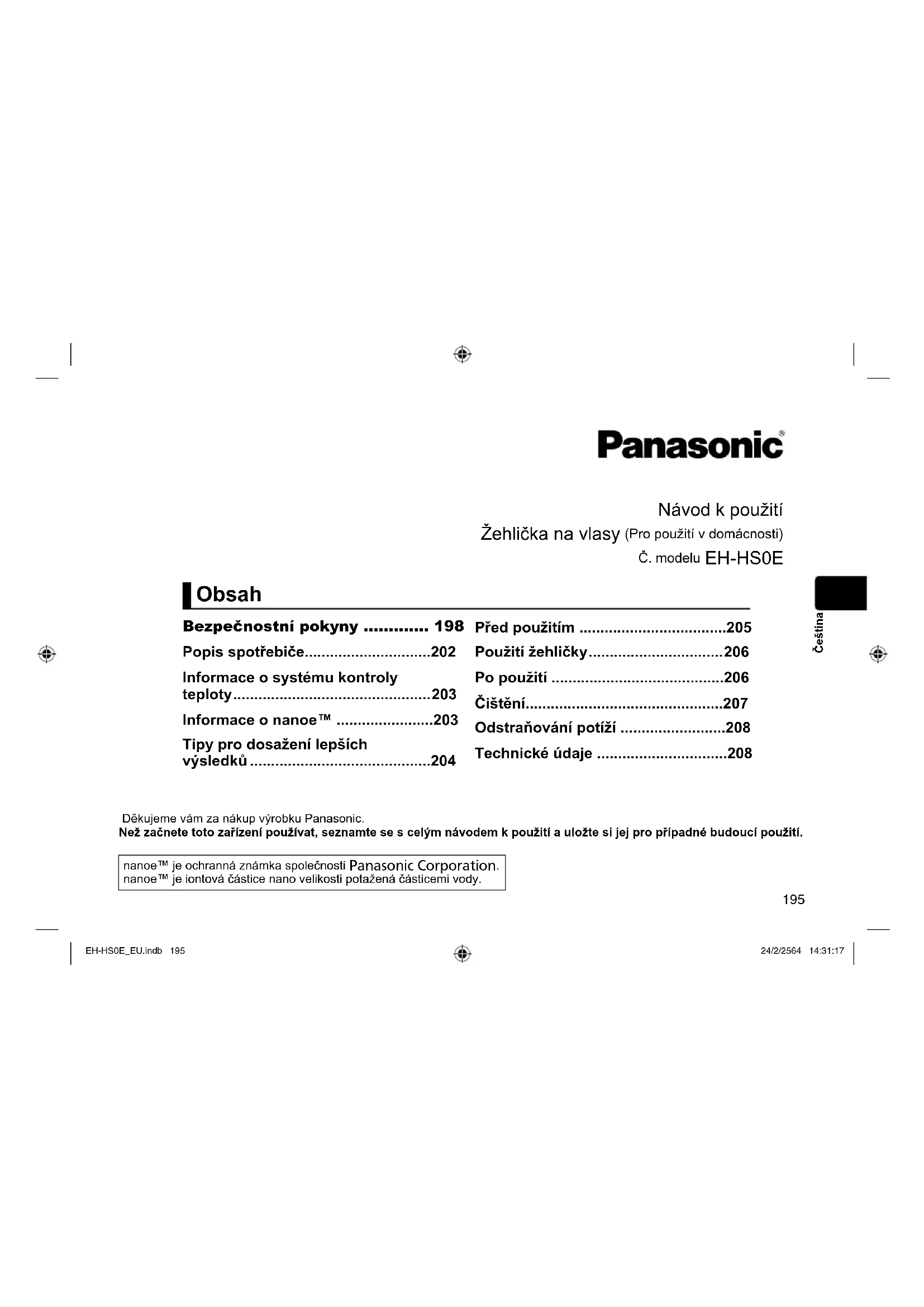 - Spotřeba energie 50 W Hodnota spotřeby energie je udávána jako aritmetický průměr vstupního výkonu, ke kterému dojde během reprezentativního časového úseku. Tento produkt je určený jen pro použití v domácnosti. EH-HS0E_EU.indb 208EH-HS0E_EU.indb 208 24/2/2564 14:31:1924/2/2564 14:31:19209 Čeština Likvidace použitých zařízení Jen pro státy Evropské unie a země s fungujícím systémem recyklace a zpracování odpadu Tento symbol na výrobcích, jejich obalech a v doprovodné dokumentaci upozorňuje na to, že se použitá elektrická a elektronická zařízení, nesmějí likvidovat jako běžný komunální odpad. Aby byla zajištěna správná likvidace a recyklace použitých výrobků, odevzdávejte je v souladu s národní legislativou na příslušných sběrných místech. Správnou likvidací přispějete k úspoře cenných přírodních zdrojů a předejdete možným negativním dopadům na lidské zdraví a životní prostředí. O další podrobnosti o sběru a recyklaci odpadu požádejte místní úřady. Při nesprávné likvidaci tohoto druhu odpadu se vystavujete postihu podle národní legislativy. EH-HS0E_EU.indb 209EH-HS0E_EU.indb 209 24/2/2564 14:31:1924/2/2564 14:31:19210 Čeština MEMO EH-HS0E_EU.indb 210EH-HS0E_EU.indb 210 24/2/2564 14:31:1924/2/2564 14:31:19211 Slovensky Návod na obsluhu (Na domáce použitie) Žehlička na vlasy Č. modelu EH-HS0E Ďakujeme vám za zakúpenie tohto výrobku Panasonic. Pred použitím spotrebiča si prečítajte tieto pokyny a odložte ich na použitie v budúcnosti. nanoe™ je ochranná známka spoločnosti Panasonic Corporation. nanoe™ je iónová nanočastica s molekulami vody. Obsah Bezpečnostné opatrenia p. 214