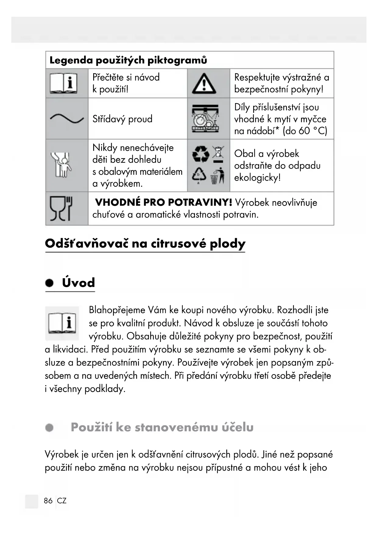 Obal a výrobek odstraňte do odpadu ekologicky! VHODNÉ PRO POTRAVINY! Výrobek neovlivňuje chuťové a aromatické vlastnosti potravin. Odšťavňovač na citrusové plody Úvod Blahopřejeme Vám ke koupi nového výrobku. Rozhodli jste se pro kvalitní produkt. Návod kobsluze je součástí tohoto výrobku. Obsahuje důležité pokyny pro bezpečnost, použití a likvidaci. Před použitím výrobku se seznamte se všemi pokyny k ob- sluze a bezpečnostními pokyny. Používejte výrobek jen popsaným způ- sobem a na uvedených místech. Při předání výrobku třetí osobě předejte i všechny podklady. Použití ke stanovenému účelu Výrobek je určen jen k odšťavnění citrusových plodů. Jiné než popsané použití nebo změna na výrobku nejsou přípustné a mohou vést k jeho87 CZ poškození. Výrobce neručí za škody vzniklé jiným použitím než použitím ke stanovenému účelu. Výrobek není určen kvýdělečné činnosti. Popis dílů
