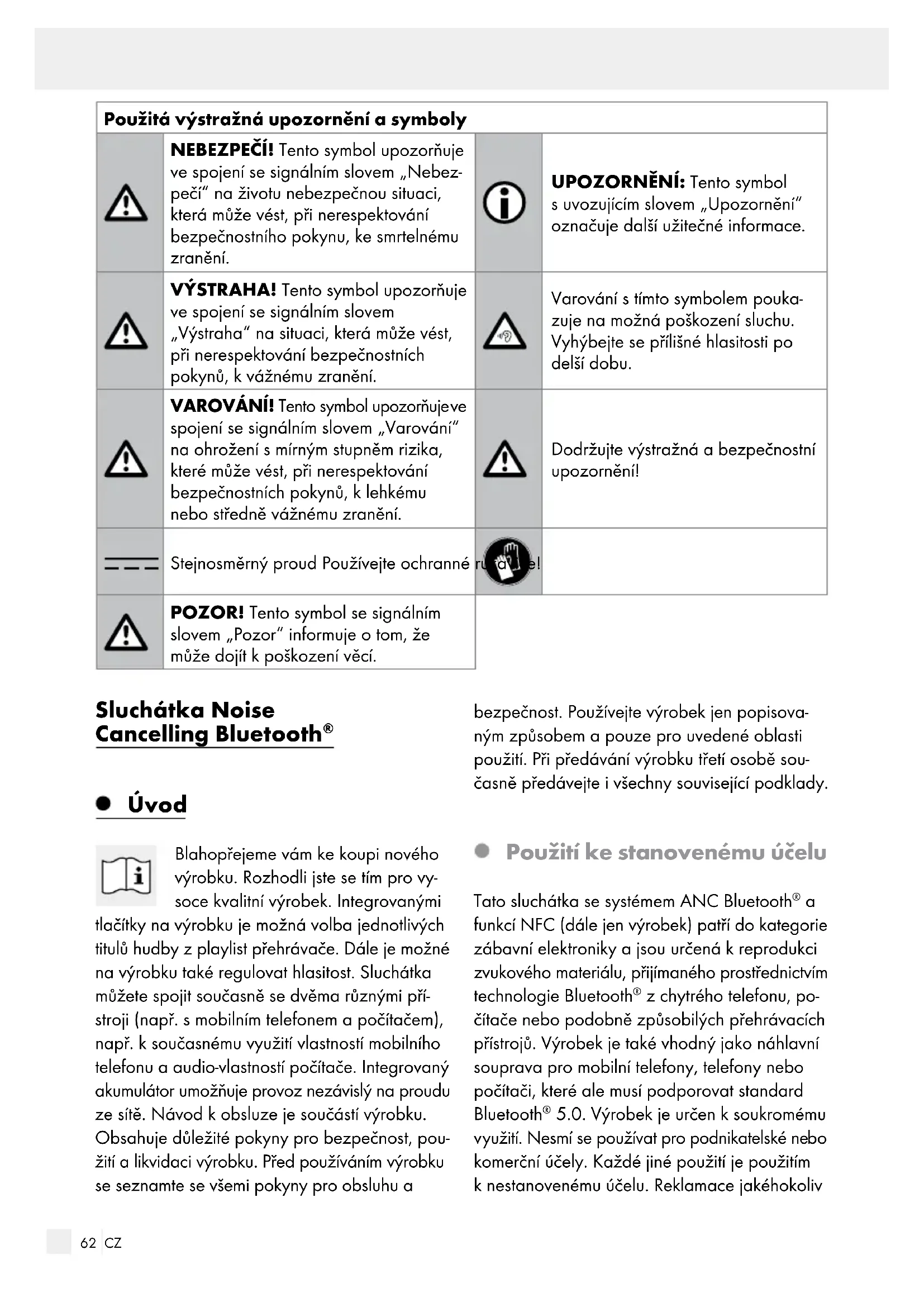 .............................................................. Strana 66 Spojení prostřednictvím NFC ...............................................................................................Strana 67 Smazání seznamu spojení ....................................................................................................Strana 67 Hlasové zprávy ..................................................................................................................... Strana 67 Připojení sluchátek přes audio kabel ................................................................................... Strana 67 Funkce aktivního potlačení šumů (ANC) .............................................................................Strana 67 Hlasové ovládání pomoc funkce Siri / Google Assistent ....................................................Strana 68 Nasazení sluchátek...............................................................................................................Strana 68 Funkce tlačítek na sluchát-kách při přehrávání hudby ........................................................Strana 68 Funkce tlačítek na sluchátkách při použití náhlavní soupravy ...........................................Strana 68 Čištění ................................................................................................................................... Strana 69 Skladování .......................................................................................................................Strana 69 Odstranění poruch ....................................................................................................Strana 69 Odstranění do odpadu .......................................................................................... Strana 70 Zjednodušené EU prohlášení o konformitě ......................................... Strana 70 Záruka .................................................................................................................................Strana 70 Postup v případě uplatňování záruky .................................................................................. Strana 71 Servis ......................................................................................................................................Strana 7162 CZ Použitá výstražná upozornění a symboly NEBEZPEČÍ! Tento symbol upozorňuje ve spojení se signálním slovem „Nebez- pečí“ na životu nebezpečnou situaci, která může vést, při nerespektování bezpečnostního pokynu, ke smrtelnému zranění. UPOZORNĚNÍ: Tento symbol suvozujícím slovem „Upozornění“ označuje další užitečné informace. VÝSTRAHA! Tento symbol upozorňuje ve spojení se signálním slovem „Výstraha“ na situaci, která může vést, při nerespektování bezpečnostních pokynů, kvážnému zranění. Varování s tímto symbolem pouka- zuje na možná poškození sluchu. Vyhýbejte se přílišné hlasitosti po delší dobu. VAROVÁNÍ! Tento symbol upozorňuje