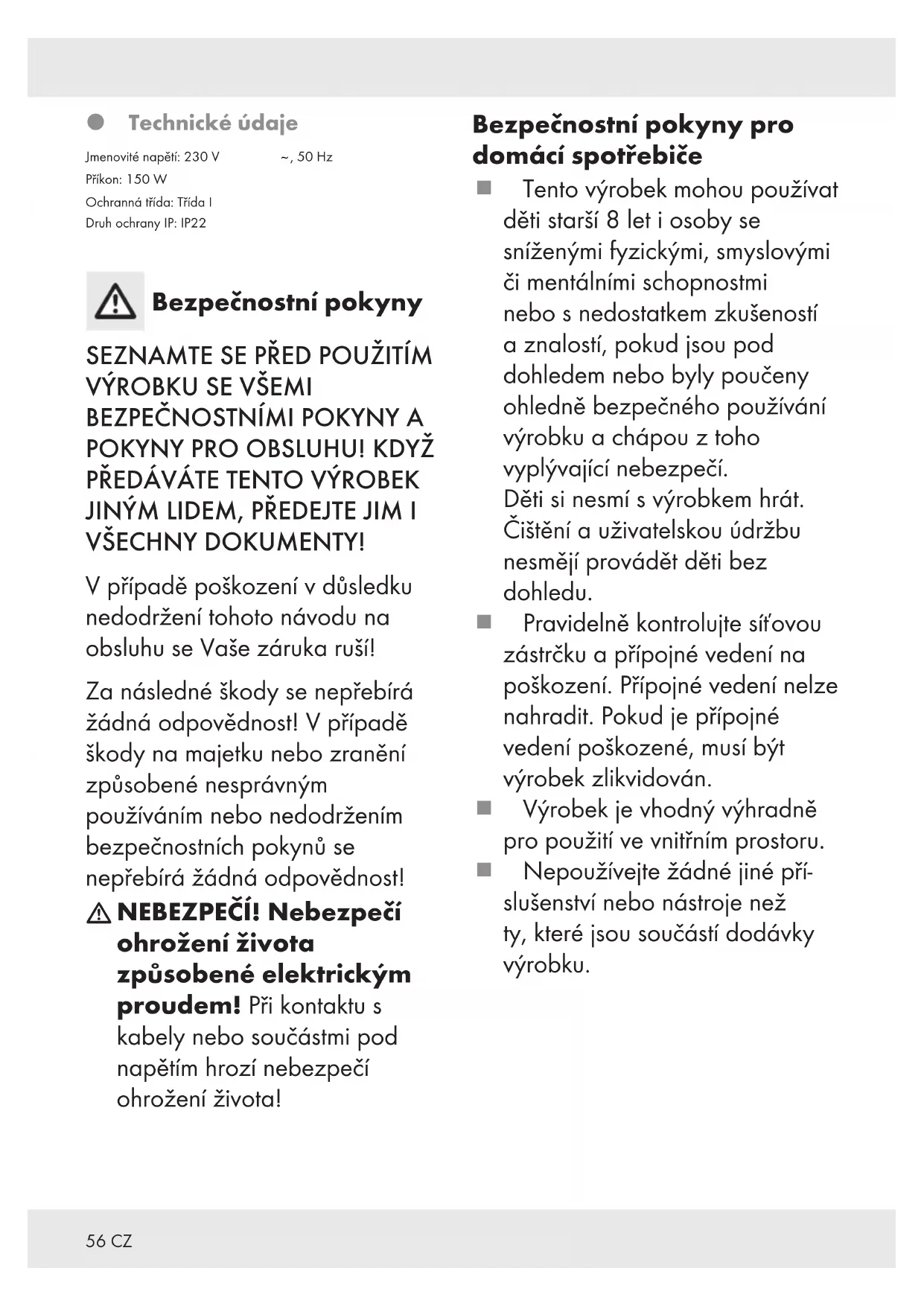 VAROVÁNÍ! Horké povrchy! Některé části výrobku mohou být velmi horké a způsobit popáleniny. Doporučuje se obzvláštní opatrnost, pokud jsou přítomny děti a ochranu vyžadující osoby. Vadné díly smí být nahrazeny jen originálními náhradními díly. Pouze u těchto dílů je zaručeno, že jsou splněny bezpečnostní požadavky. Chraňte výrobek před vlhkostí a proniknutí kapalin. Vytáhněte přípojné vedení ze zásuvky pouze za síťovou zástrčku. Neprovozujte výrobek v blízkosti otevřených plamenů. Neumisťujte výrobek přímo pod nebo nad elektrickou zásuvku. V případě nastalých poruch a bouřky vytáhněte síťovou zástrčku ze zásuvky. Nepoužívejte výrobek nikdy vbezprostřední blízkosti koupací vany, sprchy nebo plaveckého bazénu. Výrobek provozujte pouze s úplně odvinutým přípojným vedením. Přípojné vedení nikdy nenavíjejte kolem výrobku. Dbejte na to, aby se přípojné vedení nedostalo do styku s horkými povrchy. Pokládejte přípojné vedení tak, že přes ně nemůže zakopnout.