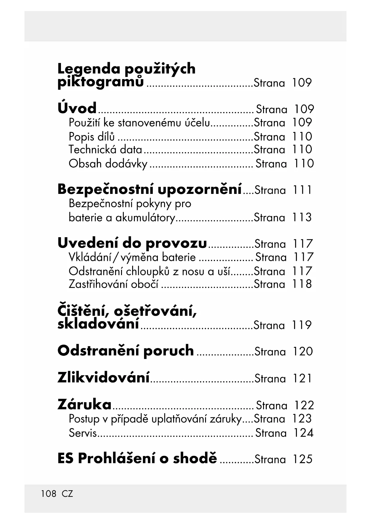 Ochranné pouzdro Technická data Baterie: 1,5 V , AA, alkalická baterie Krytí: IPX5 (chráněno proti stříkající vodě) Emise akustického tlaku: < 72 dB(A) K = 3 dB(A) Obsah dodávky 1zastřihovač nosních a ušních chloupků 1 oboustranný čisticí kartáček 1ochranné pouzdro 1návod kobsluze111 CZ Bezpečnostní upozornění