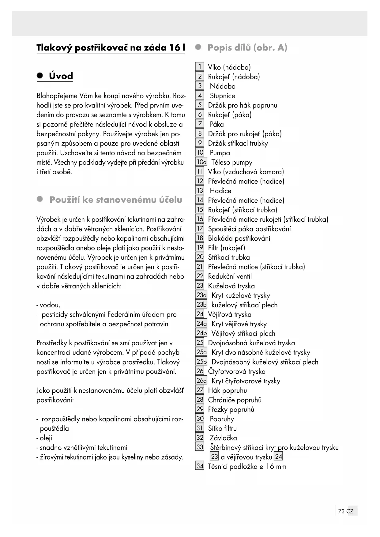 POUŽITÍ! Děti nebo osoby, které nemají dost vědomostí nebo zkušeností se zacházením se zařízením, nebo jsou omezeny ve svých tělesných, senzo- rických nebo duševních schopnostech, nesmějí zařízení používat bez dozoru nebo návodu osoby zodpovědné za bezpečnost. Děti musí zůstat pod dohledem, aby si nehrály s přístrojem. Opatrně při skladování pesticidů. Pesticidy se musí uchovávat mimo dosah dětí. Při likvidaci pesticidů se musí dodržovat bezpečnostní po- kyny výrobce. Držte postřikovací vybavení mimo dosah dětí a mladistvých do 16 let. Nenechávejte výrobek za provozu bez dohledu
