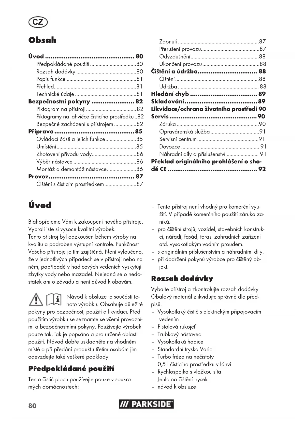 - – Tento přístroj není vhodný pro komerční vyu- žití. V případě komerčního použití záruka za- niká. – pro čištění strojů, vozidel, stavebních konstruk- cí, nářadí, fasád, teras, zahradních zařízení atd. vysokotlakým vodním proudem. – s originálním příslušenstvím a náhradními díly. – při dodržení pokynů výrobce pro čištěný ob- jekt. Rozsah dodávky Vybalte přístroj a zkontrolujte rozsah dodávky. Obalový materiál zlikvidujte správně dle před- pisů. – Vysokotlaký čistič s elektrickým připojovacím vedením – Pistolová rukojeť – Trubkový nástavec – Vysokotlaká hadice – Standardní tryska Vario – Turbo fréza na nečistoty – 0,5 l čisticího prostředku v láhvi – Rychlospojka s vložkou síta – Jehla na čištění trysek – návod k obsluze Úvod Blahopřejeme Vám kzakoupení nového přístroje. Vybrali jste si vysoce kvalitní výrobek. Tento přístroj byl odzkoušen během výroby na kvalitu a podroben výstupní kontrole. Funkčnost Vašeho přístroje je tím zajištěná. Není vyloučeno, že v jednotlivých případech se v přístroji nebo na něm, popřípadě v hadicových vedeních vyskytují zbytky vody nebo mazadel. Nejedná se o nedo- statek ani o závadu a není důvod k obavám. Návod k obsluze je součástí to- hoto výrobku. Obsahuje důležité pokyny pro bezpečnost, použití a likvidaci. Před použitím výrobku se seznamte se všemi provozní- mi a bezpečnostními pokyny. Používejte výrobek pouze tak, jak je popsáno a pro určené oblasti použití. Návod dobře uskladněte na vhodném místě a při předání produktu třetím osobám jim odevzdejte také veškeré podklady. Předpokládané použití Tento čistič ploch používejte pouze vsoukro- mých domácnostech: Úvod 80 Předpokládané použití p. 80