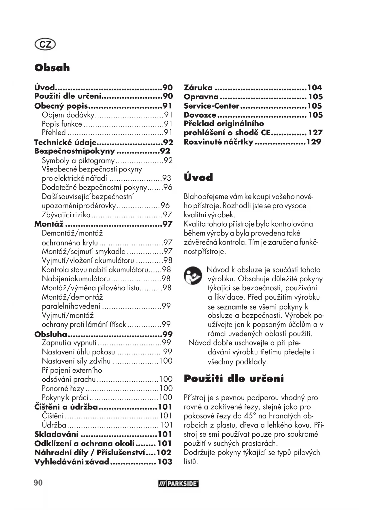 - Úvod Blahopřejeme vám ke koupi vašeho nové- ho přístroje. Rozhodli jste se pro vysoce kvalitní výrobek. Kvalita tohoto přístroje byla kontrolována během výroby a byla provedena také závěrečná kontrola. Tím je zaručena funkč- nost přístroje. Návod k obsluze je součástí tohoto výrobku. Obsahuje důležité pokyny týkající se bezpečnosti, používání a likvidace. Před použitím výrobku se seznamte se všemi pokyny k obsluze a bezpečnosti. Výrobek po- užívejte jen k popsaným účelům a v rámci uvedených oblastí použití. Návod dobře uschovejte a při pře- dávání výrobku třetímu předejte i všechny podklady. Použití dle určení Přístroj je s pevnou podporou vhodný pro rovné a zakřivené řezy, stejně jako pro pokosové řezy do 45° na hranatých ob- robcích z plastu, dřeva a lehkého kovu. Pří- stroj se smí používat pouze pro soukromé použití v suchých prostorách. Dodržujte pokyny týkající se typů pilových listů. Překlad originálního prohlášení o shodě CE p. 127