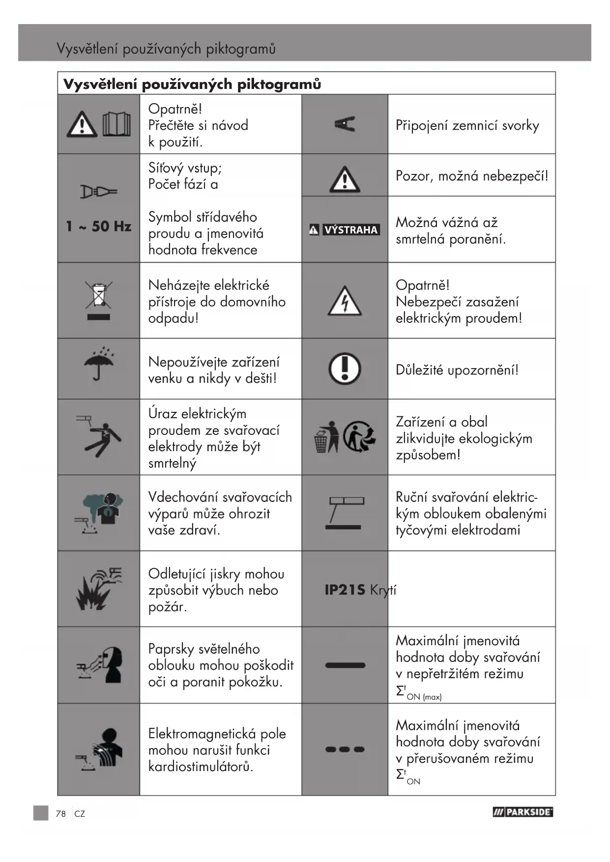 1 ~ 50 Hz Síťový vstup; Počet fází a Symbol střídavého proudu a jmenovitá hodnota frekvence Pozor, možná nebezpečí! VÝSTRAHA Možná vážná až smrtelná poranění. Neházejte elektrické přístroje do domovního odpadu! Opatrně! Nebezpečí zasažení elektrickým proudem! Nepoužívejte zařízení venku a nikdy v dešti! Důležité upozornění! Úraz elektrickým proudem ze svařovací elektrody může být smrtelný Zařízení aobal zlikvidujte ekologickým způsobem! Vdechování svařovacích výparů může ohrozit vaše zdraví. Ruční svařování elektric- kým obloukem obalenými tyčovými elektrodami Odletující jiskry mohou způsobit výbuch nebo požár. IP21S Krytí Paprsky světelného oblouku mohou poškodit oči a poranit pokožku. Maximální jmenovitá hodnota doby svařování v nepřetržitém režimu