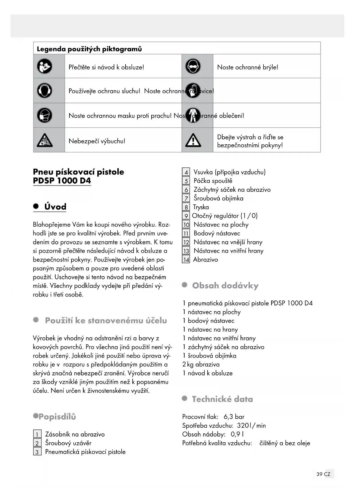 Abrazivo Obsah dodávky 1 pneumatická pískovací pistole PDSP 1000 D4 1 nástavec na plochy 1 bodový nástavec 1 nástavec na hrany 1 nástavec na vnitřní hrany 1 záchytný sáček na abrazivo 1 šroubová objímka 2 kg abraziva 1 návod kobsluze Technické data Pracovní tlak: 6,3 bar Spotřeba vzduchu: 320 l / min Obsah nádoby: 0,9 l Potřebná kvalita vzduchu: čištěný a bez oleje40 CZ Hodnoty nastavení pro práce: nastavený pracovní tlak na redukčním ventilu nebo manometru filtru maximálně 6,3 bar. Hodnota emise hluku: Naměřené hodnoty hluku podle EN 1265. Hodno- cená hladina akustické intenzity A pneumatického nástroje je typicky: Hladina intenzity zvuku: L = 94 dB(A) Nepřesnost: K = 3 dB(A) Hladina akustického výkonu: L = 105 dB(A) Nepřesnost: K = 3 dB(A) Používejte ochranu sluchu! Hodnota emise vibrací: Celková hodnota vibrací stanovená podle EN ISO 20643: ah < 2,5 m / s