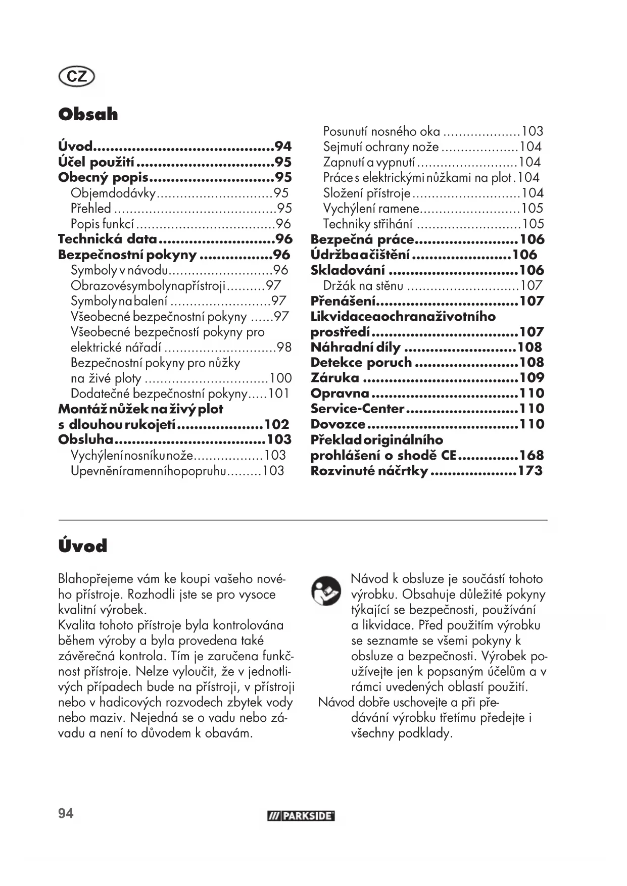 - Bezpečnostní pokyny pro nůžky na živé ploty p. 100