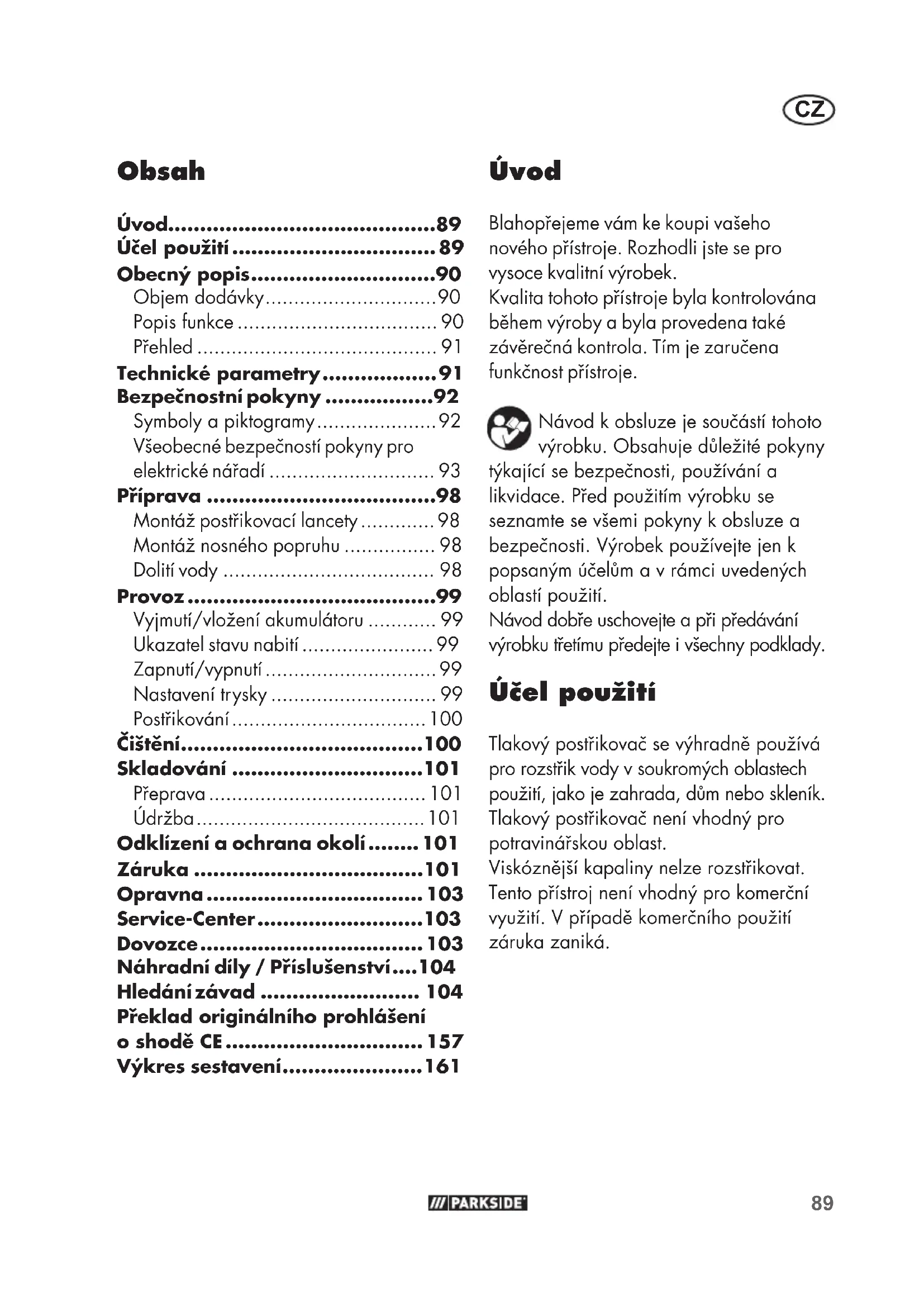- Úvod Blahopřejeme vám ke koupi vašeho nového přístroje. Rozhodli jste se pro vysoce kvalitní výrobek. Kvalita tohoto přístroje byla kontrolována během výroby a byla provedena také závěrečná kontrola. Tím je zaručena funkčnost přístroje. Návod k obsluze je součástí tohoto výrobku. Obsahuje důležité pokyny týkající se bezpečnosti, používání a likvidace. Před použitím výrobku se seznamte se všemi pokyny k obsluze a bezpečnosti. Výrobek používejte jen k popsaným účelům a v rámci uvedených oblastí použití. Návod dobře uschovejte a při předávání výrobku třetímu předejte i všechny podklady. Účel použití Tlakový postřikovač se výhradně používá pro rozstřik vody v soukromých oblastech použití, jako je zahrada, dům nebo skleník. Tlakový postřikovač není vhodný pro potravinářskou oblast. Viskóznější kapaliny nelze rozstřikovat. Tento přístroj není vhodný pro komerční využití. V případě komerčního použití záruka zaniká. Překlad originálního prohlášení o shodě CE p. 157