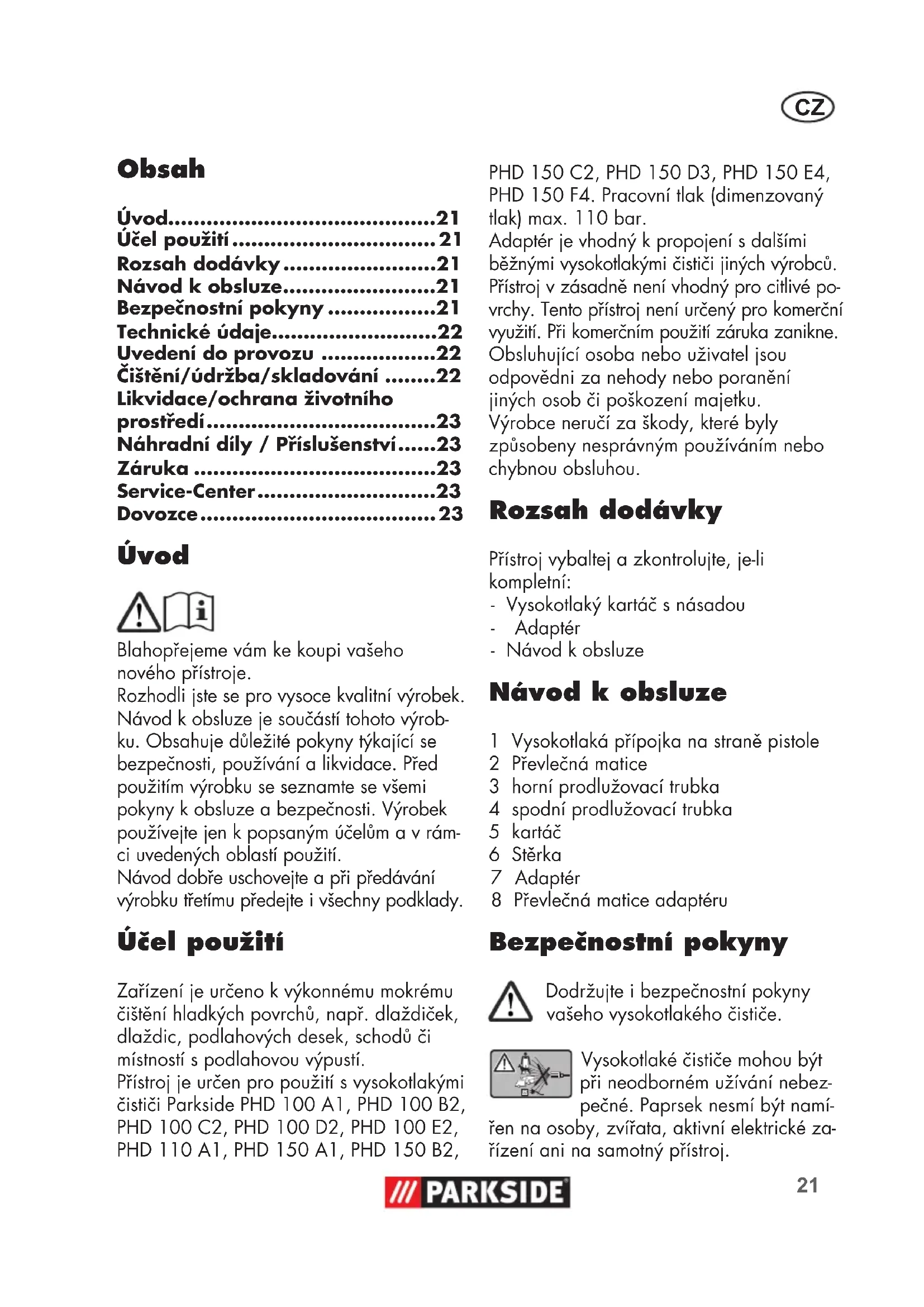 - Dovozce Úvod Blahopřejeme vám ke koupi vašeho nového přístroje. Rozhodli jste se pro vysoce kvalitní výrobek. Návod k obsluze je součástí tohoto výrob- ku. Obsahuje důležité pokyny týkající se bezpečnosti, používání a likvidace. Před použitím výrobku se seznamte se všemi pokyny k obsluze a bezpečnosti. Výrobek používejte jen k popsaným účelům a v rám- ci uvedených oblastí použití. Návod dobře uschovejte a při předávání výrobku třetímu předejte i všechny podklady. Účel použití Zařízení je určeno k výkonnému mokrému čištění hladkých povrchů, např. dlaždiček, dlaždic, podlahových desek, schodů či místností s podlahovou výpustí. Přístroj je určen pro použití s vysokotlakými čističi Parkside PHD100A1, PHD100B2, PHD100C2, PHD100D2, PHD 100 E2, PHD 110 A1, PHD150A1, PHD150B2, PHD 150 C2, PHD 150 D3, PHD 150 E4, PHD 150 F4. Pracovní tlak (dimenzovaný tlak) max. 110 bar. Adaptér je vhodný k propojení s dalšími běžnými vysokotlakými čističi jiných výrobců. Přístroj v zásadně není vhodný pro citlivé po- vrchy. Tento přístroj není určený pro komerční využití. Při komerčním použití záruka zanikne. Obsluhující osoba nebo uživatel jsou odpovědni za nehody nebo poranění jiných osob či poškození majetku. Výrobce neručí za škody, které byly způsobeny nesprávným používáním nebo chybnou obsluhou. Rozsah dodávky Přístroj vybaltej a zkontrolujte, je-li kompletní: - Vysokotlaký kartáč s násadou - Adaptér - Návod k obsluze Návod k obsluze 1 Vysokotlaká přípojka na straně pistole 2 Převlečná matice 3 horní prodlužovací trubka 4 spodní prodlužovací trubka 5 kartáč 6 Stěrka 7 Adaptér 8 Převlečná matice adaptéru Bezpečnostní pokyny Dodržujte i bezpečnostní pokyny vašeho vysokotlakého čističe. Vysokotlaké čističe mohou být při neodborném užívání nebez- pečné. Paprsek nesmí být namí- řen na osoby, zvířata, aktivní elektrické za- řízení ani na samotný přístroj.22 p. 23