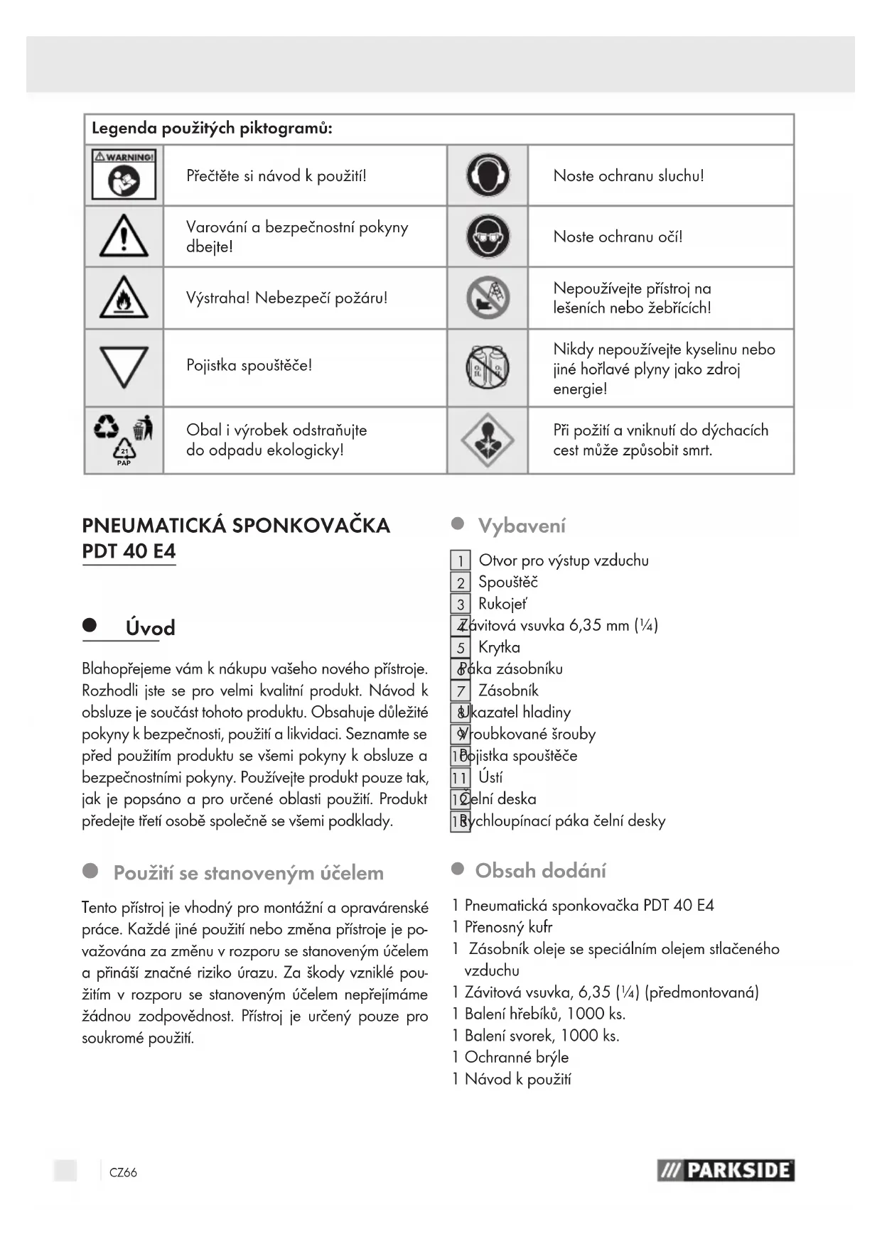 Obsah dodání 1 Pneumatická sponkovačka PDT 40 E4 1 Přenosný kufr 1 Zásobník oleje se speciálním olejem stlačeného vzduchu 1 Závitová vsuvka, 6,35 (¼) (předmontovaná) 1 Balení hřebíků, 1000 ks. 1 Balení svorek, 1000 ks. 1 Ochranné brýle 1 Návod k použití Přečtěte si návod k použití! Varování a bezpečnostní pokyny dbejte! Výstraha! Nebezpečí požáru! Noste ochranu sluchu! Noste ochranu očí! Pojistka spouštěče! Nepoužívejte přístroj na lešeních nebo žebřících! Nikdy nepoužívejte kyselinu nebo jiné hořlavé plyny jako zdroj energie! Obal i výrobek odstraňujte do odpadu ekologicky! Legenda použitých piktogramů: