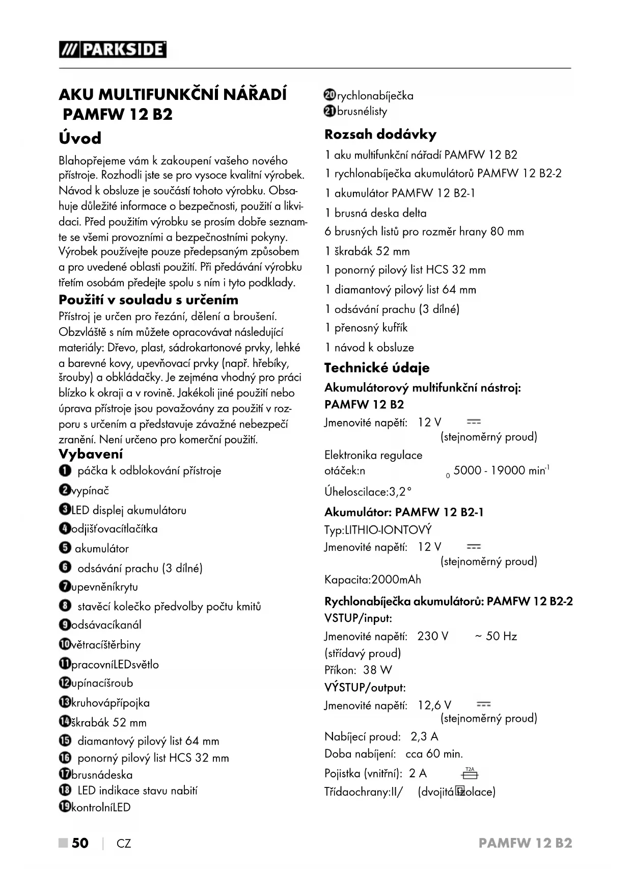 Úhel oscilace: 3,2° Akumulátor: PAMFW 12 B2-1 Typ: LITHIO-IONTOVÝ Jmenovité napětí: 12 V (stejnoměrný proud) Kapacita: 2000 mAh Rychlonabíječka akumulátorů: PAMFW 12 B2-2 VSTUP/input: Jmenovité napětí: 230 V